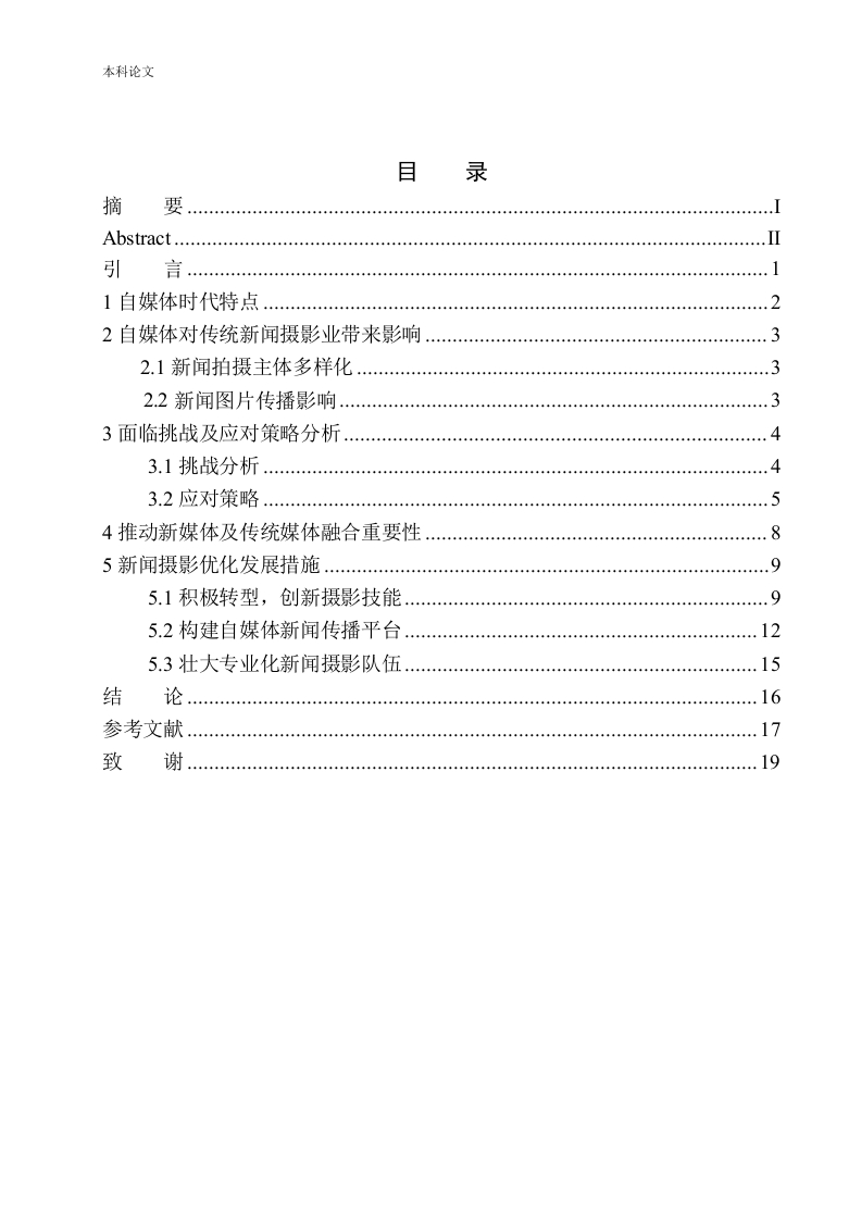 本科论文目录摘要…Abstract.引言1自媒体时代特点2自媒体对传统新闻摄影业带来影响2.1新闻拍摄主体多样化…2.2新闻图片传播影响…3面临挑战及应对策略分析.…43.1挑战分析….43.2应对策略…4推动新媒体及传统媒体融合重要性85新闻摄影优化发展措施95.1积极转型,创新摄影技能5.2构建自媒体新闻传播平台5.3壮大专业化新闻摄影队伍15结16参考文献致谢本科论文摘要网络技术和信息技术的发展使得自媒体形式异军突起,其属于平民化、私人化、自主化的传播模式,借助自媒体方式,人们可以扩大信息接收和传输渠道,增加对新闻资讯的浏览速度,随时随地借助智能终端记录生活和信息,因此对于图像的依赖度随之提升。部分自媒体传播人员会借助高品质的修图和拍摄技术完成图像处理,提升新闻传播质量,因此对于传统新闻摄影行业带来较大冲击和挑战。本文将新闻摄影和自媒体作为研究主体,通过概述自媒体时代的特点,分析自媒体对传统新闻摄影业的影响、面临的挑战及应对策略,围绕摄影技能、视频平台等方面探究新时期新闻摄影优化发展的具体措施,确保新闻摄影工作贴近受众生活。经过课题研究后可以得出,虽然新闻摄影行业在自媒体时代受到了较大的冲击,不过能够反向促进新闻摄影互动和发布的便捷性,激励专业新闻工作者结合时代发展趋势提升自身业务能力和专业素质,适应自媒体时代对新闻传播的需求,同时净化传播信息,创新传统新闻是摄影模式。关键词:新闻摄影;自媒体;媒体融合本科论文AbstractWith the development of network technology and information technology,itbelongs to the mode of communication,which is civilian,private and autonomous.With the help of self-media,people can expand the channels of receiving andtransmitting information,increase the speed of browsing news information,recordlife and information at any time and anywhere with the help of intelligent terminal,so the dependence on increased.Some self-media communicators will usehigh-quality image repair and shooting technology to complete image processing,improve the quality of news communication,so it brings great impact andchallenge to the traditional news photography industry.This article takes the newsphotography and the self-media as the research main body,through the summaryself-media This paper analyzes the influence of self-media on the traditional newsphotography industry,challenges and coping strategies,explores the specificmeasures to optimize the development of news photography in the new era aroundphotography skills and video platform,and ensures that the news photographywork is close to the life of the audience.It can be concluded that,although thenews photography industry has been greatly impacted in the era of self-media,itcan reversely promote the convenience of news photography interaction andrelease,encourage professional journalists to improve their own professionalability and professional quality in combination with the development trend of thetimes,adapt to the demand of news communication in the era of self-media,at thesame time purify the information of communication and innovate the traditionNews is photography mode.Keywords:news photography;self-media;media integration