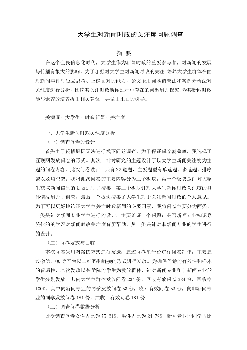 大学生对新闻时政的关注度问题调查摘要在这个全民信息化时代,大学生作为新闻时政的重要参与者,对新闻的发展与传播有很大的影响。为了加强对大学生对新闻时政的关注,培养大学生群体在面对新闻事件时独立思考、正确面对的能力,论文采用问卷调查法和案例分析法对关注度进行分析,围绕其关注时政新闻过程中存在的问题展开探究,为其新闻时政参与素养的培养提出相关建议,并做出正面的引导。关键词:大学生:时政新闻:关注度一、大学生新闻时政关注度分析(一)调查问卷的设计首先由于疫情原因无法进行线下问卷调查,为了保证问卷覆盖率,我选择了互联网发放问卷的形式。其次,针对研究的主题设计了以大学生新闻关注度为主题的问卷内容,此次问卷设计一共有22道题,主要题型有单选题、多选题、排序题以及填空题。我将此次问卷的主要内容分为三个板块,第一个板块是针对大学生获取新闻信息的领域进行了搜集,第二个板块针对大学生新闻时政关注度的具体情况展开了调查,最后一个板块搜集了大学生对于关注新闻时政的个人意见。为了可以更好地论证大学生关注时政新闻的必要因素,我将问卷主要分为两类,一类是针对新闻专业学生进行的设计,主要论证一个问题:是否新闻专业知识系统化的的学习对新闻时政关注度有所帮助。另一类是针对非新闻专业的学生进行的设计。(二)问卷发放与回收本次问卷采用网络的方式进行发送,通过问卷星平台进行问卷制作,主要通过微信,QQ等平台以二维码和链接的形式进行发放。为确保问卷的有效性和样本的普遍性,本次发放以某学院的学生为发放群体,针对新闻专业和非新闻专业的学生分别发放。共向大学生群体发放问卷234份,回收有效问卷234份,回收率100%。其中向新闻专业的同学发放问卷53份,收回有效问卷53份,向非新闻专业的同学发放问卷181份,共收回有效问卷181份。(三)调查问卷数据分析此次调查问卷女性占比为75.21%,男性占比为24.79%。新闻专业的同学占比22.65%,非新闻专业的同学占比77.35%。关于学习新闻相关知识对新闻认知的影响的调查可以得知,在调查的新闻专业的学生当中,64.15%的大学生认为系统地学习新闻专业知识对日常的时政新闻认知有影响,35.83%的大学生认为有一定的影响(图1)。是64.15%图1:学习新闻相关知识对新闻认知的影响关于新闻关注度时长的调查中,69.66%的大学生每天获取新闻信息的时长为一个小时以内,有25.21%的同学每天浏览新闻时长为13个小时(图2)。大部分大学生对于新闻信息的关注度不够,时间投入较少会影响大学生参与时政新闻的程度。只有保证了大学生新闻信息关注度的时长,才能让他们在关注时政新闻的同时拥有参与新闻引导的实操机会。69.56%b4025.21%203.85%128%一小时以内三小五小灯图2:新闻关注度时长关于大学生浏览新闻信息类型的调查可以得知,大学生浏览新闻信息的类型中排在首位的是民生新闻,其次分别是娱乐八卦,国家大事,周边新闻,排在最后的是国际新闻(图3)。民生新闻和娱乐八卦这两类新闻由于本身具有很强的不确定性以及涉及群体复杂的特征,就需要更多的非权威媒体进行参与引导。1473.091.48图3:大学生浏览新闻信息的类型关于大学生获取新闻信息最主要途径方面的调查可以得知,大学生获取新闻信息。主要是通过手机、电视等媒介了解新闻,同时还通过微博热搜和抖音快手等短视频平台进行获取。其中微博热搜这一获取方式比例最大,占比51.28%。相比于占比12.82%的微信公众号和占比5.13%的新闻类app,微博和抖音快手等新兴的自媒体平台更受大学生的青睐。相比于微信公众号和专业的新闻类app来说,接受信息更具有局限性,受众往往被迫随着推荐榜的新闻热度而关注某一新闻,因而在使用某个平台获取新闻信息时个人的主动性关注意识至关重要(图4)。51.28%5.13%☐2.149%100