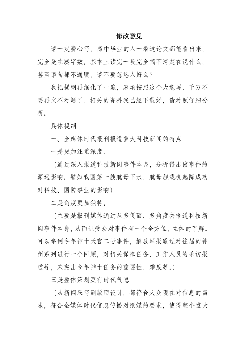 修改意见请一定费心写,高中毕业的人一看这论文都能看出来,完全是在凑字数,基本上读完一段完全搞不清楚在说什么,甚至语句都不通顺,请不要忽悠人好么?我把提纲再细化了一遍,麻烦按照这个大意写,千万不要再文不对题了。相关的资料我已经下载好,请对照仔细分析。具体提纲一、全煤体时代报刊报道重大科技新闻的特点一是更加注重深度。(通过深入报道科技新闻事件本身,分析得出该事件的深远影响。譬如我国第一艘航母下水、航母舰载机起降成功对科技、国防事业的影响)二是角度更加独特。(主要是报刊媒体通过从多侧面、多角度去报道科技新闻事件本身,从而让受众对事件有一个全方位、立体的了解。可以举例今年神十天官二号事件,解放军报通过对往届的神州系列进行一个回顾,对相关保障任务、工作人员的采访报道等,来突出今年神十任务的重要性、难度等。)三是整体策划更有时代气息(从新闻采写到版面设计,都符合大众现在对信息的需求,符合全媒体时代信息传播对纸媒的要求,使得整个重大科技新闻报道不仅耐读耐看,还具有很高的收藏价值。)二、报刊在全媒体时代的作用分析一是继承传统的科普作用。二是促进全面科技素质提高。三是有利于促进社会进步,助力中国梦的实现。三、全媒体时代报刊对重大科技新闻报道的可持续发展一要坚持规律研究,加强新闻筛选。(对新闻的选取,包括数量、质量、内容等方面)二要坚持文字为王,加强报道深度。三要坚持读者至上,加强新闻策划。写手若有不大清楚的地方,请联系18923961691,QQ515249564对全媒体时代报刊媒体对重大科技新闻的报道的一些思考【摘要】科学技术与人民生活密切相关,科技强国战略一直是国家坚持贯彻的深入人心的重要策略,因此全媒体时代下科技新闻的相关报道不可忽视。科学技术是第一生产力,知识不断的改变着人类之命运,科技不断改变着人类之生活方式。科学技技水平的提高是衡量一个国家的有关综合国力进一步提高的标志,报刊媒体主要负责于科学技术的创新、发明及应用的大范围普及和宣传的工作,可见媒体报道的任务之重大。比如科技日报的版面栏目《科技改变生活》,经常报道一些为人类生活小常识的温馨提示与分析,方面人们了解生活中科技小常识。基于以上认识,结合自合自身经验及平时对报刊媒体的了解,本文探讨全媒体时代报刊媒体对重大科技新闻的报道的一些思考的内容,仅作抛砖引玉。【关键词】全媒体时代报刊媒体重大科技新闻报道一、全媒体时代报刊报道重大科技新闻的特点(一)跟踪时事热点解放军报、人民日报、科技日报等内容科技含量比较高,这些报刊具有时事热点更新快的特点,毕竟是属于中央媒体类报刊,比如科技日报及时报道的有关天宫二号飞船的最新情况,如天宫二号和天宫一号进行比较分析,天宫二号有针对于新的航天任务进一步进行技术方面的相关适应性的改造,天宫二号除了开展了高水平空间应用和科学研究外,还进一步将前期验证飞船空间站的一部分关键性技术,如进行了与货运飞船同时进展推进剂补加技术的试验。(二)报刊专题丰富性以《人民日报》关于“神十飞天”的专题相关报道为例,人民日报划分了把大报刊板块,分别为实时拍摄、太空遨游、幕后解析、神十评说等八大板块。实时拍摄又包含整个过程的回顾及24小时的滚动更新图片。这主要是从科技新闻内容的不同难易程度及层次不一的科技新闻信息来划分的报刊板块,不但能够起到报刊专题丰富的作用,而且也在一定程度上满足不同群体的信息接受者的阅读方面的需求。二、报刊在全媒体时代的作用分析(一)利于为和谐发展提供动力重大科技类新闻的传播作为具有连接作用的桥梁,连接于工业、农业的经济