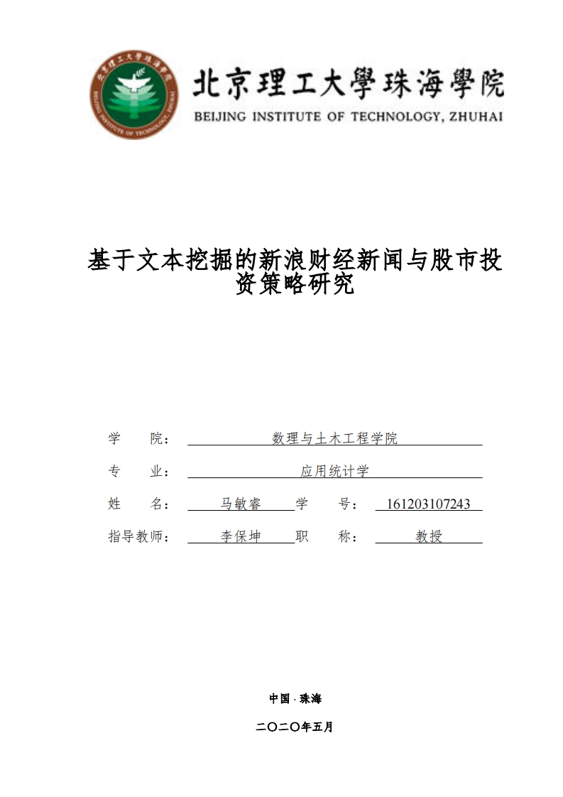 北京理工大學珠海學院BEIJING INSTITUTE OF TECHNOLOGY,ZHUHAI基于文本挖掘的新浪财经新闻与股市投资策略研究学数理与土木工程学院专业:应用统计学姓名:马敏睿学号:161203107243指导教师:李保坤职教授北京理工大学珠海学院2020届本科生毕业论文诚信承诺书本人郑重承诺:我所呈交的毕业论文《基于文本挖掘的新浪财经新闻与股市投资策略研究》是在指导教师的指导下,独立开展研究取得的成果,文中引用他人的观点和材料,均在文后按顺序列出其参考文献,论文使用的数据真实可靠。承诺人签名:年月日北京理工大学珠海学院2020届本科生毕业论文基于文本挖掘的新浪财经新闻与股市投资策略研究摘要在21世纪这个生活节奏飞快的年代,信息发展可以说是我们日常生活中变化最快速的东西了。而网络作为了解信息最便捷的方式之一,己经成为人类获取信息必不可少的工具。通过网络这种方式获取信息不仅方便快捷,而且获取的信息相对其他方法更全面有效。在这样的时代大背景下,如何用最恰当的方式分析出海量信息中的相关信息,提取其中最具有代表性及区别性的关键字,并对海量文本信息进行合理有效的分类,对于网站搜索引攀提供关键字、用户节约时间成本,从而提高网站满意度等都有着十分重要的意义。股票也是我们日常生活中最经常被拿出来讨论的财经话题。我国的股市一直对我国的经济发展做出了不可忽视的极大贡献。在大众追求“股票热”时,一部分人赚到了一定收益,甚至以此发家致富,但也有人在股市上不断亏损,甚至倾家荡产。如何制定有效的投资策略,在避免亏损的前提上达到一定收益效果,也是我们需要关注的话题。本论文的研究内容是以新浪财经为例,基于文本挖掘技术,利用Pyho语言的爬虫技术,对新浪财经的文本信息进行爬取,最终得到了五类共750个有效样本,进而将这750个样本随机分为训练集和测试集,采用朴素贝叶斯模型,对样本文本进行了分类,并检验了模型的准确度,实现了财经新闻的文本分类技术,并对模型进行了优缺点评价。最后根据设立的关键字制定了有效的相关领域投资策略,并在同花顺软件进行了策略回测。本文的研究,实现了朴素贝叶斯在文本分类中的应用,对网站文本板块分类有一定的实践意义,为网站进行文本分类及检验提供了有效依据,并为用户制定投资策略提供了一定的依据。关峡词:财经文本挖掘朴素贝叶斯投资策略