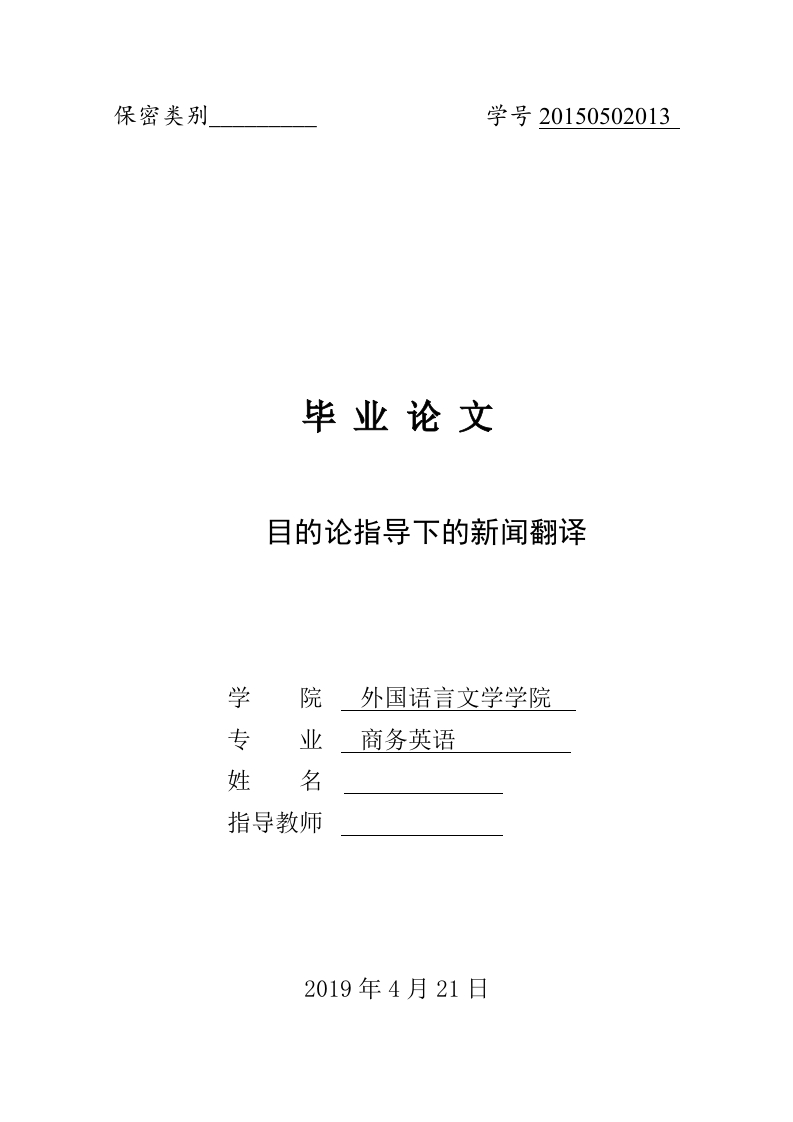 保密类别学号20150502013毕业论文目的论指导下的新闻翻译学院外国语言文学学院专业商务英语姓名指导教师2019年4月21日BACELOR'S DEGREE THESIS OFWUHAN QINGCHUAN UNIVERSITYChinese-English Translation of News underthe Guidance of Skopos TheoryCandidate:Ren JiayaoSupervisor:Hu XiaoshenApril 21st,2019武汉晴川学院本科毕业论文(设计)原创性声明本人郑重声明:1.所呈交的毕业论文(设计),是本人在导师的指导下,独立进行研究工作所取得的成果。2.除文中已经注明引用的内容外,本论文(设计)不含任何其他个人或集体已经发表或撰写过的作品或成果。3.对本论文(设计)的研究做出重要贡献的个人和集体,均已在论文(设计)中以明确方式标明。本声明的法律结果由本人承担。论文作者签名:年月日
