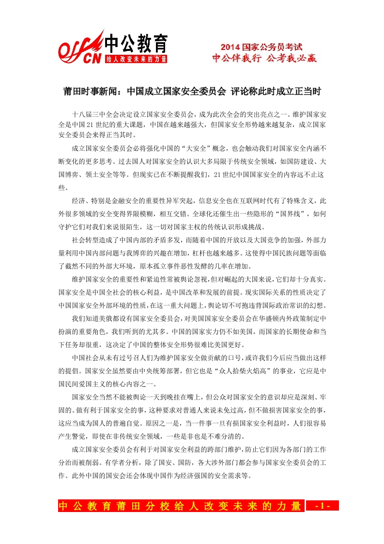 2014国家公务员考试中公伴我行公考我必赢莆田时事新闻:中国成立国家安全委员会评论称此时成立正当时十八届三中全会决定设立国家安全委员会,成为此次全会的突出亮点之一。维护国家安全是中国21世纪的重大课题,中国在越来越强大,但国家安全形势越来越复杂,成立国家安全委员会来得正当其时。成立国家安全委员会必将强化中国的“大安全”概念,也会触动我们对国家安全内涵不断变化的更多思考。过去国人对国家安全的认识大多局限于传统安全领域,如国防建设、大国博弈、领土安全等等。但现实已在不断提醒我们,21世纪中国国家安全的内容远不止这些。经济、特别是金融安全的重要性异军突起,信息安全也在互联网时代有了特殊含义,此外很多领域的安全变得界限模糊,相互交错。全球化还催生出一些隐形的“国界线”,如何守护它们对我们来说很陌生,这一切对国家主权的传统认识形成挑战。社会转型造成了中国内部的矛盾多发,而随着中国的开放以及大国竞争的加强,外部力量利用中国内部问题与我博弈的兴趣在增加,杠杆也越来越多。这使得中国民族问题等面临了截然不同的外部大环境,原本孤立事件恶性发酵的几率在增加。维护国家安全的重要性和紧迫性常被舆论忽视,但对崛起的大国来说,它们却十分真实。国家安全是中国全社会的核心利益,是中国改革和发展的前提。现实国际关系的性质决定了中国国家安全外部环境的性质,在这一重大问题上,舆论切不可抱违背国际政治常识的幻想。我们知道美俄都设有国家安全委员会,对美国国家安全委员会在华盛顿内外政策制定中扮演的重要角色,我们听到的尤其多。中国的国家实力仍不如美国,而国家的长期使命和当下任务却很重,这决定了中国的整体安全形势很难比美国更好。中国社会从未有过号召人们为维护国家安全做贡献的口号,或许我们今后应当做出这样的提倡。国家安全虽然要由中央统筹部署,但它也是“众人拾柴火焰高”的事业,它应是中国民间爱国主义的核心内容之一。国家安全当然不能被舆论一天到晚挂在嘴上,但公众对国家安全的意识却应是深刻、牢固的。做有利于国家安全的事,这种要求对普通人来说未免过高,但不做损害国家安全的事,这应当成为国人的普遍自觉。原因之一是,当一件事一旦有损国家安全利益时,人们很容易产生警觉,即使在非传统安全领域,一些是非也是不难分清的。成立国家安全委员会有利于对国家安全利益的跨部门维护,防止它们因为各部门的工作分治而被削弱。有学者分析,除了国安、国防,各大涉外部门都会参与国家安全委员会的工作。此外中国的国安会还会体现中国作为经济强国的安全需求等。中公教育莆田分校给人改变未来的力量-1·2014国家公务员考试中公伴我行公考我必赢现代社会对国家安全质量的要求空前提高,无论它在哪个方面出问题,发生对外领土摩擦、遭到恐怖主义袭击、或者金融稳定受到意外冲击,都有可能引发社会的敏感反应。我们希望国家安全委员会的成立能有效应对新的形势,让中国社会这部超大机器运转得更稳更平安,让社会信心更加牢固。2014年国家公务员考试备考资料:http://putian.offcn.com/html/guojiagongwuyuan/yueduziliao/中公教育莆田分校给人改变未来的力量-2·