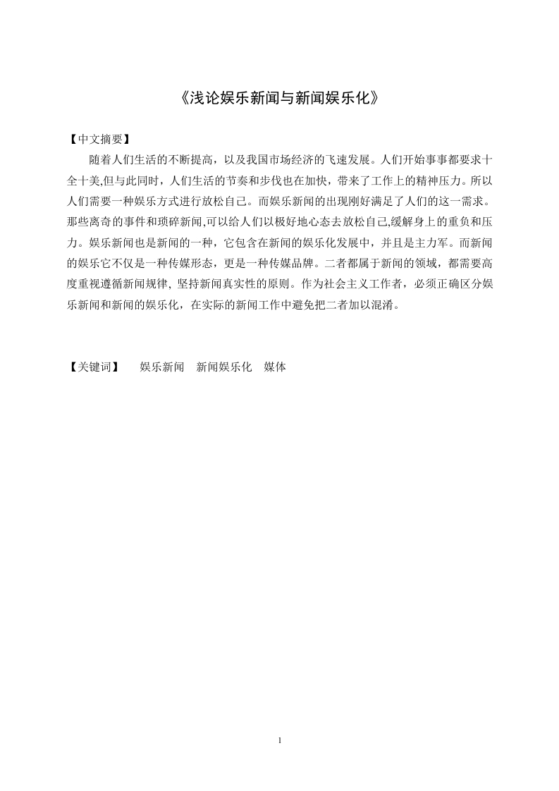 《浅论娱乐新闻与新闻娱乐化》【中文摘要】随着人们生活的不断提高,以及我国市场经济的飞速发展。人们开始事事都要求十全十美,但与此同时,人们生活的节奏和步伐也在加快,带来了工作上的精神压力。所以人们需要一种娱乐方式进行放松自己。而娱乐新闻的出现刚好满足了人们的这一需求。那些离奇的事件和琐碎新闻,可以给人们以极好地心态去放松自己,缓解身上的重负和压力。娱乐新闻也是新闻的一种,它包含在新闻的娱乐化发展中,并且是主力军。而新闻的娱乐它不仅是一种传媒形态,更是一种传媒品牌。二者都属于新闻的领域,都需要高度重视遵循新闻规律,坚持新闻真实性的原则。作为社会主义工作者,必须正确区分娱乐新闻和新闻的娱乐化,在实际的新闻工作中避免把二者加以混淆。【关键词】娱乐新闻新闻娱乐化媒体1【English Abstract】as people living unceasing enhancement,and the rapid development of marketeconomy in China.People began to demand everything's great,but at the same time,people the rhythm of the life and step also to speed up,bring the work stress.Sopeople need a kind of entertainment for relax.And the emergence of theentertainment news just satisfy the people of this demand.The bizarre events andtrivial news,can give people in a very good way to relax,alleviate the burden of bodyand pressure.Entertainment news is also a kind of news,it contains in newsentertainment of development,and is the main force.And the entertainment news it isnot only a media form,is also a kind of media brand.Both belong to the news in thefield,all need attaches great importance to follow the law of news media,adhere tothe principle of news authenticity.As a socialist workers,must distinguish betweenentertainment news and entertainment of news,in actual news work the two to avoidconfusion.Key words Entertainment news News recreation turn media目录引言…第一章娱乐新闻.…51.1“娱乐新闻”的界定...51.2娱乐新闻吸引着更多观众的眼睛1.3娱乐新闻逐渐的改变了年龄界限..2.1新闻的娱乐化的界定...2.2新闻娱乐化现象的产生原因..第三章娱乐新闻的现状及其发展..·3.1娱乐新闻拥有着广阔的市场..3.2娱乐新闻失真化的原因..4.1弊端的表现及其原因....第五章娱乐新闻与新闻娱乐联系...105.1娱乐新闻与新闻娱乐区别阐述..5.2娱乐新闻包含于新闻的娱乐化..5.3正确正视新闻娱乐化趋势....115.4把握好新闻与娱乐的“度”结论3