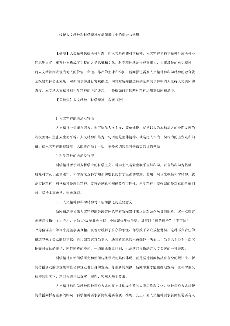 浅谈人文精神和料学精神在新闻报道中的融合与运用【摘要】人类精神包括两种形态,即人文精神和科学精神。人文精神和科学精神形成两种不同思维方式,相互补充构成了完整的人类思维和文化。料学精神就是指尊重事实、实事求是的求实精神:而人文精神则表现为对人的价值、命运、尊严的主球和维护。新闻报道需要人文精神和科学精神的融合就是既要坚持公正立场,对新闻事件进行客观报道,同时对新闻报道特别是新闻事件中的人坚持人文关怀的态度。本文从人文精神和科学精神的内涵谈起,并分析如何将这两种精神运用到新闻报道中。【关键词】人文精神科学精神客观理性1.人文精神的内涵及特征人文精神一词源自西方,也可称作人文主义,简单地说,就是以人为本和对人的全面发展的终极关怀,主张人生而平等。人文精神归结为一句话就是主体精神,就是把人作为一切行为的出发点和归宿。在人文精神的视野里,人的尊严高于一切,主要强调的是对普或美的价值判断。2.料学精神的内涵及特征科学精神源于西方哲学中的科学主义。科学主义是紧密联系自然科学,以自然科学为基础,研究科学认识论和逻辑、科学方法及科学知识的增长的哲学流派和思潮。若用一句话来概括科学精神,就是实证精神,料学精神是理性精神,要符合逻辑和规律要有可控性。料学精神主要强调的是对真的价值判断,坚持实事求是、追求真理。二、人文精神和科学精神对于新闻报道的重要意义新闻报道中如果人文精神缺失或错位意味着新闻媒体未尽到对公众负责的职责。这一点在灾难新闻报道中尤为突出,比如2003年非典初期,全国媒体集体失语,甚至以“可防可治”“不可怕”“毋信谣言”等词来掩盖事实真相,虽暂时缓解了公众的恐慌,却导致了公众放松警惕,这种不负责任的报道忽视了公众的知情权:再比如对灾难当事人、遇难者家属的采访媒体一哄而上,当事人不得不一次次地面对媒体的采访,回答同样的提问,一遍遍地重温悲剧,也是新闻报道缺乏人文关怀的一种表现。料学精神在新闻学研究和新闻传播领域的具体体现,就是坚持新闻传播有自身的规律性。新闻传播活动的客观规律推动和规范着自身的发展,尊重新闻规律,新闻事业才能更好地发展。在科学主义精神的影响下,新闻报道将以真实、理性、客观为基本要求。人文精神和科学精神两种思维方式的互补才构成完整的人类思维和文化,这种思维方式对新闻传播同样有重要的影响。科学精神要求新闻报道要客观、准确、公正,而人文精神要求新闻报道要有人文关怀、要追求道德上的普。在新闻报道实践中,仅有人文精神或科学精神是不够的,仅有人文精神,就会由于过多的感性因素而丧失新闻报道应有的理性精神以及客观性:而若仅信奉科学精神,忽视人文精神,就会导致新闻报道由于追求真而忽视对新闻报道中人的关注,新闻报道虽然客观地呈现了新闻事实,但传递的却是冷冰冰的信息,还可能产生的不良的后果,甚至对新闻当事人造成不必要的伤害。因此有必要将科学精神和人文精神融入新闻报道中。三、新闻报道中人文精神和科学精神的融合新闻报道应具有人文关怀,通过新闻报道实现对人的命运、生存状态真正的关心、重视以及思考。同时,新闻报道又必须以真实、理性、客观为基本要求。因此人文精神和科学精神在新闻报道中的融合与运用就是要以新闻传播的客观性为理论和实践基础的受众本位思考,1.以一种关怀的姿态传递信息,关注人,尊重人,理解人将帮助受众获知信息、了解社会、得到安慰为新闻报道的终极目的。举例来讲,交通事故新闻,我们关注的是什么?是现场的惨状,还是关注在事故中受伤的人?讲人文精神就要追求美追求普,呈现车祸现场破碎的玻璃、变形的车体、满地的鲜血是一种客观,但却是人们不愿看到的客观:而关注事故中人的感受、境况也是一种客观,这样的报道体现了人文精神所包含的普的本意,同情他们而不仅仅做冷漠的看客。2.建立受众本位意识在相当一段时间里,媒体基本上采取的是灌输式宣传方式,以单一的手段传播党政意志和媒体观点,对社会上的弱势群体缺乏应有的关心关注,受众处于不被重视甚至被忽略的地位。如今,随着新媒体的兴起,信息交互性增强,更多的普通公众可以通过新媒体发出自己的声音。在当前的新闻媒体格局下,传统媒体已经开始改变传播思维,充分运用新媒体有事,改变灌输式的传者本位的传播方式,注重报道形式的创新以及对芸芸众生的关注,通过视点下移,确立平民化视角,挖掘并揭示平凡的人内在的精神价值。从一定角度说,反常性的东西对新闻报道更具有吸引力,但是新闻报道首先要肩负的是社会责任,信息流通的目的是为了促进社会的进步和发展,是以民众同政府的沟通交流、以社会认同、以对人的终极关注和关怀、以社会各阶层各得其所为出发点和归宿点的。比如揭丑报道,我们揭露问趣是为了解决问趣,是为了消减社会的信息不对称,而不能为社会制造“精神恐慌”。在新闻传播中融入人文主义关怀,将使新闻传播更有深度,更有广度,更有感召力,更有影响力。3.坚持新闻报道的真实性原则真实性是新闻报道的生命。坚持“贴近群众、贴近生活、贴近实际”的三贴近原则是新闻报道的基本原则,要加强新闻媒体的社会责任意识的强化,