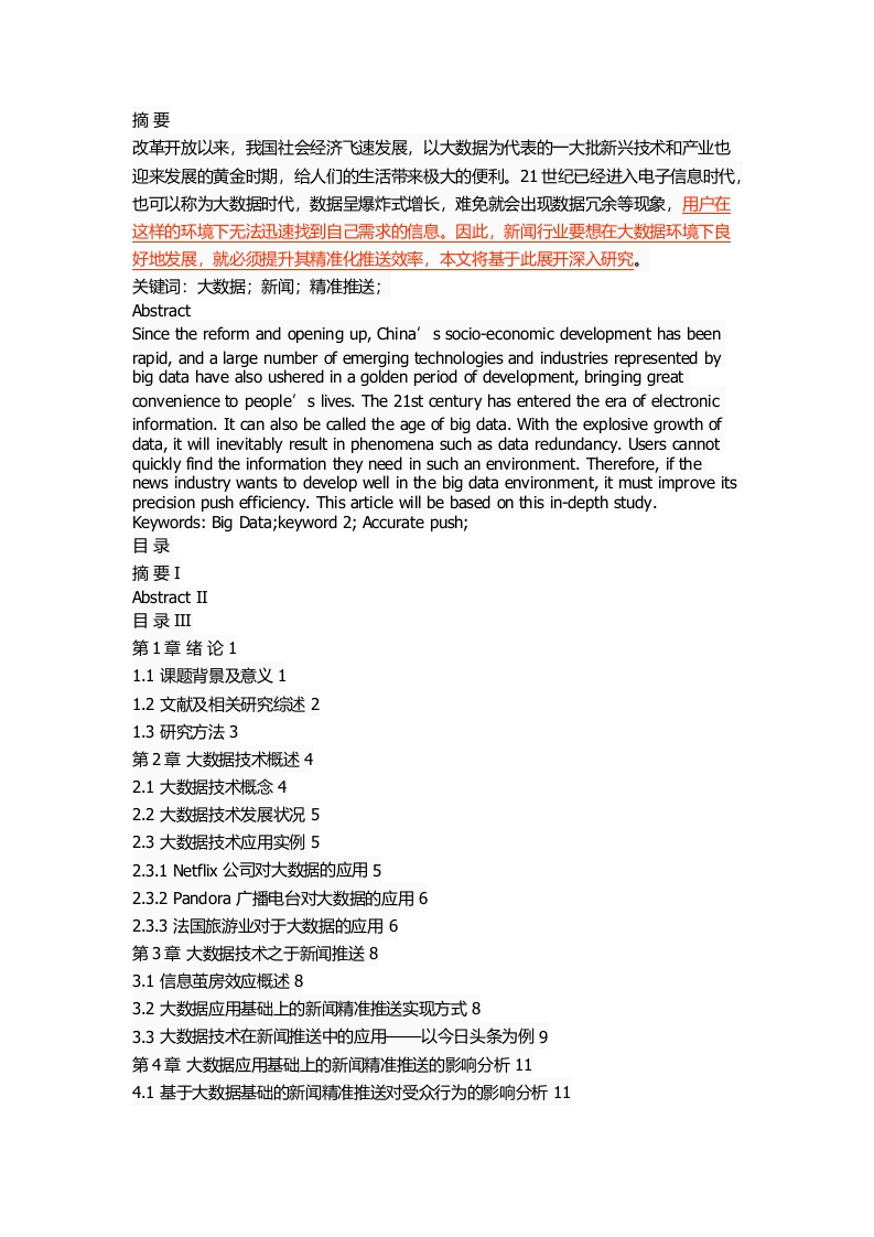 摘要改革开放以来,我国社会经济飞速发展,以大数据为代表的一大批新兴技术和产业也迎来发展的黄金时期,给人们的生活带来极大的便利。21世纪已经进入电子信息时代,也可以称为大数据时代,数据呈爆炸式增长,难免就会出现数据冗余等现象,用户在这样的环境下无法迅速找到自己需求的信息。因此,新闻行业要想在大数据环境下良好地发展,就必须提升其精准化推送效率,本文将基于此展开深入研究。AbstractSince the reform and opening up,China's socio-economic development has beenrapid,and a large number of emerging technologies and industries represented bybig data have also ushered in a golden period of development,bringing greatconvenience to people's lives.The 21st century has entered the era of electronicinformation.It can also be called the age of big data.With the explosive growth ofdata,it will inevitably result in phenomena such as data redundancy.Users cannotquickly find the information they need in such an environment.Therefore,if thenews industry wants to develop well in the big data environment,it must improve itsprecision push efficiency.This article will be based on this in-depth study.Keywords:Big Data;keyword 2;Accurate push;目录摘要IAbstract IⅡ目录Ⅲ第1章绪论11.1课题背景及意义11.2文献及相关研究综述21.3研究方法3第2章大数据技术概述42.1大数据技术概念42.2大数据技术发展状况52.3大数据技术应用实例52.3.1 Netflix公司对大数据的应用52.3.2 Pandora广播电台对大数据的应用62.3.3法国旅游业对于大数据的应用6第3章大数据技术之于新闻推送83.1信息茧房效应概述83.2大数据应用基础上的新闻精准推送实现方式83.3大数据技术在新闻推送中的应用一以今日头条为例9第4章大数据应用基础上的新闻精准推街送的影响分析114.1基于大数据基础的新闻精准推送对受众行为的影响分析114.2基于大数据基础的新闻精准推送对新闻产生的影响分析114.3基于大数据基础的新闻精准推送对社会的影响分析124.4基于大数据基础的新闻精准推送对技术发展的影响分析12第5章基于大数据应用的新闻精准推送带来的风险135.1信息安全风险135.2伦理学风险135.3个人发展风险145.4社会舆论导向风险14第6章大数据应用基础上的新闻精准推送风险对策156.1新闻受众对于风险的对策156.2新闻媒体即数据管理者对于风险的对策156.3政府及相关监管机构对于风险的对策16第7章大数据应用基础上的新闻精准推送前景展望17结论18参考文献19致谢20第1章绪论1.1课题背景及意义蒸汽机和电力先后宣告了两次工业革命的到来,如今,大数据技术将给人们带来新的一轮科技革命,在如今这个信息时代,数据已经成为了“石油”般的资源,具有非的战略意义。2012年7月,联合国发布的《大数据促发展:挑钻战与机遇》中,明确提出人类已经步入了大数据时代。文章中指出,在新世纪中,大数据对于世界各国都是一次历史性的巨大机遇,抓紧这一机遇,即是乘上了发展的顺风车。而美国在此之前,于2012年3月启动了“大数据发展和研究计划“,并承诺向大数据领域提供更多的资金支持。在2015年3月5日,李克强总理在十二届全国人民代表大会第三次会议上所作的《2015年国务院政府工作报告》中,就道次运用了大数据、云计算等科技手段进行了数据的收集、内容的分析,辅以智库的支持,从而有了这次精彩的政府工作报告。从以上内容可以看出,大数据早已上升到了各国的战略层面。近年来,大数据在新闻传播领域的实践应用,率先取得了令人可喜而震撼过的成果,新闻媒体对于用户数据的收集和挖掘,以及在新闻中的呈现,为新闻增添了更多的活力,同时也分析并掌握了受众的反馈,从而使得新闻的精准推送成为了现实,内容的打开率和阅读率得到了大幅的提升。大数据技术对于传统新闻行业带来的变革,使得众多抓住了机遇的企业得到了发展的良机,甚至对传媒行业进行了一定程度的洗牌。以今日头条、百度、微博等媒体为代表,通过少对于大数据技术的应用,其在新闻业务领域得到了良好的发展,作为新兴企业的今日头条市值更是实现了飞跃式的增长。而大数据技术不仅给新闻业务带来了变革,也直接或间接地影响着我们的生活,可以说每个人都在生产着数据,同时被数据反作用、被数据悄然想影响乃至改变。到了2017年,大数据逐渐上升为不同类型新闻媒体晋升为一流媒体的必经之路。同年12月8日,习近平总书记在中共中央政治局集体学习会上提出了国家大数据战略,更是针对我国传媒业大数据应用提出了更明确的目标。大数据技术与新闻行业的结合早已开始,用户数据统计、用户偏好分析以及推送算法的发展,使得基于大数据技术的新闻精准推送成为了人们生活中的日常体验。作为大数据技术在其他行业中的应用,新闻精准推送也伴随着隐私权、伦理学、舆论监督等方面的问题,在抓住发展机遇的同时,积极面临与之相伴的挑战与困难,将是政府、媒体、受众等每一方都需要重视的事情。1.2文献及相关研究综述大数据这一概念来自于英文词组“Big Date“的直译。美国未来学家阿尔文托夫勒于1980年首次语言了大数据的发展前景,但其此后一直作为一个概念而存在。首份关于大数据研究报告,则在2011年6月由知名咨询公司麦肯锡发布,并正式提出了“大数据”这一概念,由此也掀起了大数据相关研究的序幕。清华大学的刘建明教授(2013)发表的《“大数据时代”的奇幻虚构》一