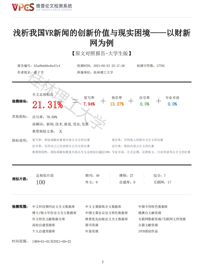 维普论文检测系统VIP PAPER CHECK SYSTEM浅析我国V新闻的创新价值与现实困境一一以财新网为例【原文对照报告-大学生版】报告编号:52ad9eb6be6a47e4检测时间:2021-05-2322:17:38检测字符数:17785作者姓名:黄子芳所属单位:桂林理工大学全文总相似比复写率他引率自引率专业术语检测结论:21.31%7.94%13.37%0.0%十0.0%其他指标:自写率:78.69%高频词:新闻,技术,报道,受众,发展典型相似文章:无指标说明:复写率:相似或疑似重复内容占全文的比重他引率:引用他人的部分占全文的比重自引率:引用自己已发表部分占全文的比重自写率:原创内容占全文的比重典型相似性:相似或疑似重复内容占全文总相似比超过30%专业术语:公式定理、法律条文、行业用语等占全文的比重总相似片段期刊:49博硕:27综合:7相似片段:100外文:0自建库:0互联网:17检测范围:中文科技期刊论文全文数据库中文主要报纸全文数据库中国专利特色数据库博士/硕士学位论文全文数据库中国主要会议论文特色数据库港澳台文献资源外文特色文献数据全库维普优先出版论文全文数据库互联网数据资源/互联网文档资源高校自建资源库图书资源古籍文献资源个人自建资源库年鉴资源IPUB原创作品时间范围:1989-01-01至2021-05-23维普论文检测系统VIP PAPER CHECK SYSTEM原文对照颜色标注说明:■自写片段■复写片段(相似或疑似重复)引用片段(引用)■专业术语(公式定理、法律条文、行业用语等)学号:3172120505223题目类型:毕业论文(设计、论文、报告)桂林理工大学GUILIN UNIVERSITY OF TECHNOLOGY本科毕业设计(论文)工大学题目:浅析我国VR新闻的创新价值与现实困境一以财新网为例学院:公共管理与传媒学院专业(方向):传播学班级:传播学2017级2班学生:黄子芳指导教师:陈远洋年月日摘要随着信息技术和互联网的快速发展,人们的生活方式以及思维习惯发生改变,新闻传播的方式也因此开发和创新。虚拟现实(VirtualReality,简称VR)作为一项前沿的互联网技术,已经慢慢渗入民众生活的各方各面,有了VR技术的支持,创新了新闻的传播方式,R技术与新闻产业的融合带给受众崭新的新闻体验,一场新的新闻传播革蓄势待发。将虚拟现实技术应用于新闻领域,使观众仿佛置身于“第一人称视角”的新闻现场,感受VR新闻所独有的沉浸感,使新闻的创新价值和传播效果发挥最大的作用。当然,我们感受到VR新闻的创新价值的同时,也会面临许多现实困境,如新闻的真实性受到质疑、V技术的不成熟等问题亟待解决。本论文选取财新网为基础,结合《山村里的幼儿园》例子浅析我国VR新闻的创新价值与现实困境。关键词:虚拟现实技术;VR新闻A brief analysis of China's VR news innovation value and realistic difficulties--Take Caixin asan exampleStudent:HUANG Zi-Fang Teacher:CHEN Yuan-YangAbstract:With the rapid development of information technology and the Internet,people's lifestyle and thinking habit have changed,so the way of news dissemination has been developed andinnovated.As a cutting-edge Internet technology,VirtualReality (VR for short)has gradually2维普论文检测系统VIP PAPER CHECK SYSTEMpenetrated into all aspects of people's lives.With the support of VR technology,the way of newstransmission has been innovated.The integration of VR technology and the news industry brings newnews experience to the audience,and a new revolution of news communication is ready to take off.The application of virtual reality technology in the field of news makes the audience feel as ifthey are in the news scene from the "first person perspective"and feel the unique immersive sensewhile we feel the innovative value of VR news,we will also face many realistic dilemmas,such asthe authenticity of news being questioned,the immaturity of VR technology and other problems to besolved urgently.Based on Caixin,this paper analyzes the innovative value and realistic dilemma ofVR news in China with the example of "Kindergarten in a Mountain Village".Key words:Virtual reality technology:VR news目录摘要IAbstractIII一、绪论11.研究背景12.研究意义1(二)研究方法11.文献综述法22.案例分析法2二、VR新闻的发展现状2(一)国外VR新闻发展现状2(二)国内VR新闻发展现状2三、财新网“VR+新闻”的创新价值3(一)新闻制作方式创新41.新闻制作方式由复杂繁琐到简易真实42.虚拟现实新闻制作由“线性”到“网状”4(二)新闻报道形式创新41.内容上:VR新闻凸显了新闻报道的真实和深度52.技术上:声音、景别、镜头时空和画框的创新5(1)声音5(2)景别6(3)镜头时空6(4)画框7(三)新闻叙事方式创新81.虚拟现实新闻的叙事视角由“呈现”转变为“在场”92.创新式的新闻叙事方式改变了受众对新闻的体验感9(四)新闻传受关系创新101.受众成为传受关系的主体102.受众获取信息的方式由单一维度转变为多维度10(五)新闻价值理念创新101.新闻的时效性要求变低102.地理空间不受控制11四、VR新闻的现实困境11(一)对新闻真实性的质疑111.VR技术对新闻真实性的两面性113