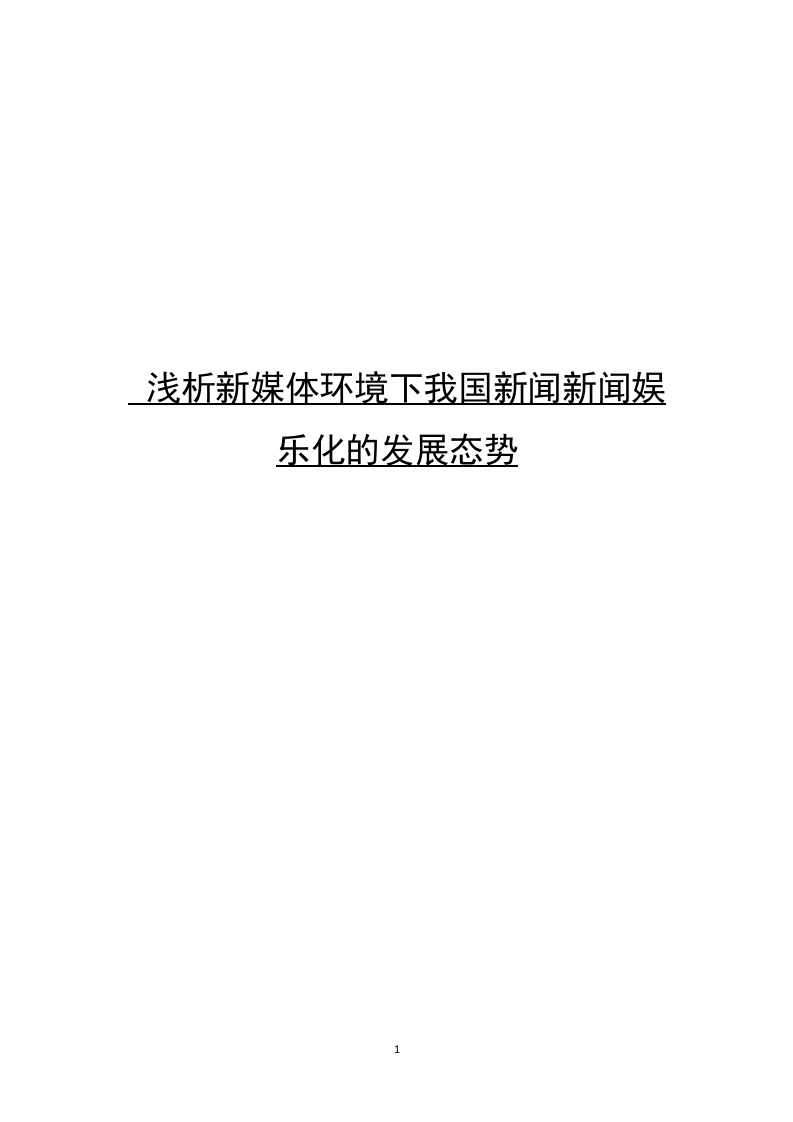 浅析新媒体环境下我国新闻新闻娱乐化的发展态势目录摘要……2(一)新闻娱乐化概述…1.新闻娱乐化的定义…42.新闻娱乐化的特点…42.1报纸新闻娱乐化的特点…42.2电视新闻娱乐化的特点…52.3互联网新闻娱乐化的特点3.新闻娱乐化的新闻分类…4.新闻娱乐化在新闻领域中的研究价值(二)新媒体环境分析…81.新媒体的定义……82.新媒体环境下的新闻传播特点…82.1新媒体环境下新闻娱乐化的塑造及特点(三)新闻娱乐化的具体分析…91.新闻娱乐化的成因分析2.新闻娱乐化中的新闻真实…113.新闻娱乐化传播的舆论效果…123.1新闻娱乐化传播的积极影响…123.2新闻娱乐化传播的消极影响…124.新闻娱乐化对记者的专业素养要求…135.新闻娱乐化与娱乐新闻的异同…14(四)新媒体环境下新闻娱乐化的发展…151.新媒体环境下新闻娱乐化的现状分析…152.新媒体环境下新闻娱乐化的发展趋势参考文献…18摘要新闻娱乐化现象在我国传媒行业中扎根已久,不论是纸媒还是电视、互联网等新闻传播媒介,无一不利用娱乐化手法对新闻进行包装,并借以其在大众传播的影响力吸引广告商投资,维系媒体的生存和发展。溯本求源,新闻娱乐化现象自19世纪在西方媒体世界萌芽并渐成体系后,经历了大约一个世纪的时间,在经济全球化的带动下融入我国传媒行业,助力我国传媒在体制改革上的突破和创新。经过多年发展,我国新闻传播事业从通过传统媒介传播延伸至通过新兴媒介与传统媒介相结合来传播,而在如今的新媒体环境下,新媒体媒介的多样性给受众提供了广阔的新闻选择范围,使得新闻娱乐化现象只增不减。过度地新闻娱乐化严重干扰了大众在人文关怀与文化传承上的品格淬炼,影响着我国社会主义精神文明的构建。因此,本文通过对大量资料的研究,总结出娱乐化新闻的特点,客观探讨其对社会带来影响,深度分析新媒体环境下我国新闻娱乐化的发展态势并提出传媒应对之法,明确了只有坚持“严肃新闻为主,娱乐化新闻为辅”的新闻理念,才是媒体实现自身价值,弘扬专业主义,承担社会责任的康庄大道。关键词新闻娱乐化新媒体新闻真实传媒体制改革大众传播ABSTRACTPhenomenon of entertainment news in China's media industry hastaken root,whether in print or TV,Internet and other news media,without the use of entertainment elements on the packaging of news,and to its influence in the mass media to attract advertisers investment,maintain the survival and development of media.Back,since thephenomenon of entertainment news nineteenth Century in the westernmedia world of budding and gradually formed a system,after nearly acentury of time into China's media industry driven by economic
