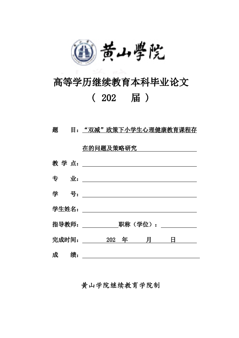 黄山学院高等学历继续教育本科毕业论文202届)题目:“双减”政策下小学生心理健康教育课程存在的问题及策略研究教学点:专学学生姓名:指导教师:职称(学位):完成时间:202年月日成黄山学院继续教育学院制学位论文原创性声明兹呈交的学位论文,是本人在指导老师指导下独立完成的研究成果。本人在论文写作中参考的其他个人或集体的研究成果,均在文中以明确方式标明。本人依法享有和承担由此论文而产生的权利和责任。声明人(签名):年月日黄山学院高等学历继续教育本科毕业论文正文目录英文摘要1前言一2(一)以“减”为本,开阔视野2(二)以“增”为本,全面发展2(三)有“的”放矢,满足需求...3(四)以“合”为主,真正起效..3二小学心理健康教育的必要性及其误区(一)小学开展心理教育的必要性.3(二)小学心理健康教育的误区..4三“双减”政策下小学生心理健康教育课程存在的问题…5555四“双减”政策下小学心理健康教育课程存在问题的优化措施(一)合理选择心理健康教育内容5(二)提高心理健康教师专业水平6(三)加强师生之间的互动交流6(四)推动家校共同进行心理教育662.建立家校联动机制..77