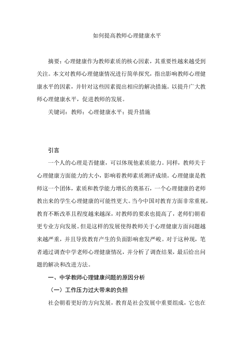 如何提高教师心理健康水平摘要:心理健康作为教师素质的核心因素,其重要性越来越受到关注。本文对教师心理健康情况进行简单探究,指出影响教师心理健康水平的因素,并针对这些因素提出相应的解决措施。以提升广大教师心理健康水平,促进教师的发展。关键词:教师:心理健康水平:提升措施引言一个人的心理是否健康,可以体现他素质能力。同样,教师关于心理健康方面能力的大小,影响着教师素质测评成绩。心理健康是教师这一个团体,素质和教学能力增长的奠基石,一个心理健康的老师教出来的学生心理健康的可能性更大。当今中国对教育方面非常重视,教育不断改革且程度越来越深,对教师的要求也提高了,老师们朝着更专业方向发展。但是这样的发展使得教师关于心理健康方面问题越来越严重,并且导致教育产生的负面影响愈发严峻。对于这种现,笔者通过调查中学老师心理健康情况,并分析了调查结果,最后给出问题的解决和改进方法。一、中学教师心理健康问题的原因分析(一)工作压力过大带来的负担社会朝着更好的方向发展,教育是社会发展中重要组成,它也在不断进步。在教育改革深化、快速知识革新和人才之间角逐,教师这个职业被人们寄予更高的要求,各方面给这个职业的压力越发沉重,从事这项工作者的压力也变得艰巨。“老师只要会教,学生就能学会”。社会、学校、家长,对老师都抱有教好教会每一个学生的期待,不同学生有不同的性格,他们对学习的接受能力、是否主动、兴趣方向等都是不同的。他们的学习成绩容易比较。但是,行为、世界观、价值观、对待学习的态度等都是不易衡量并且变化无常。教师很难从这些方面取得付出的回报,更难证实自己取得的成就。每个老师都有志向和渴望,他们希望自己能在教师这个职业中获得优异的成绩,得到相同职业人群的认可。但是,如果因为各方面原因使得自己同他人产生一定差距后,老师们会有一种失落和差距感。新课程改革对老师自身说,提出了更高的全新要求,教师面对这些新要求,对比以前会发现自身的差距,随之产生紧张感和危险感。这些压力都会对教师的心理健康产生影响,最终完成严重后果。(二)人际交往不良带来的焦虑人际关系也是一个影响各阶段教师心理问题的因素。这些人际关系主要包括,自身和领导、和同事、和学生及其家长之间。现在有一个很长时间都存在的问题,教师自身和学校管理层之间是否有和谐的关系。据调查数据,现在仅有24.77%的老师和领导能够保持融洽的关系,剩下的教师和领导之间并没有良好的关系,甚至非常差。的关系是否融洽是一个长久的问题。这种现象出现的原因主要是,老师自身的想法和学校发展方向不同,教师容易在这种不同中出现矛盾心理。中学,是学生处于叛逆期的阶段,在这一阶段中,学生们自主能力加强,独立生活的意识也越来越明显,他们不想受成年人约束,并要求家长、老师等身边成年人理解和平等对待自己。这个时候就需要教师用恰当方式缓解学生们的逆反心理,正确解决同学生之间的矛盾,但是如何解决,是每个中学老师需要思考的问题。现在大部分学生是独生子女,他们在家中受家长的宠爱,从小到大没怎么被骂过、打过,心理承受能力差,很可能因为老师一句教育的话,作出不计后果行为,这就更需要教师学会处理和学生之间的不和谐。本段所涉及的矛盾,导致老师处理人际关系时遇到的很多困难,这种困难很难解决,可又不能放任,于是老师的心理健康容易在矛盾之间受影响。(三)多种角色带来的困惑教师这个职业非常复杂,它需要老师在学校里除了做好自己的本职工作时,扮演其他各种角色,比如,心理学家、办事员、家长、朋友等。过多身份不仅使得老师本就不充足的时间和精力进一步减少,还会产生角色冲突、模糊等状况。同时,有些角色和领导、社会其他阶级人群存在矛盾,这些矛盾容易使他们发生冲突,最终会给教师造成紧张、消极等影响。教师是一个神圣的职业,是人类灵魂的修筑者,它随着社会进步不断受到冲击,职业的神圣性和社会地位产生很大差异时,教师的不同角色之间的矛盾,给教师自身带来了更多的困惑和压力。