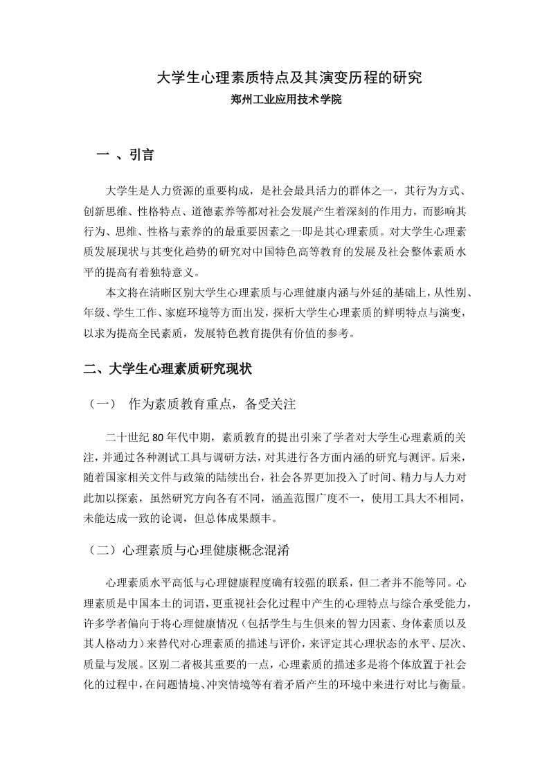 大学生心理素质特点及其演变历程的研究郑州工业应用技术学院一、引言大学生是人力资源的重要构成,是社会最具活力的群体之一,其行为方式、创新思维、性格特点、道德素养等都对社会发展产生着深刻的作用力,而影响其行为、思维、性格与素养的的最重要因素之一即是其心理素质。对大学生心理素质发展现状与其变化趋势的研究对中国特色高等教育的发展及社会整体素质水平的提高有着独特意义。本文将在清晰区别大学生心理素质与心理健康内涵与外延的基础上,从性别、年级、学生工作、家庭环境等方面出发,探析大学生心理素质的鲜明特点与演变,以求为提高全民素质,发展特色教育提供有价值的参考。二、大学生心理素质研究现状(一)作为素质教育重点,备受关注二十世纪80年代中期,素质教育的提出引来了学者对大学生心理素质的关注,并通过各种测试工具与调研方法,对其进行各方面内涵的研究与测评。后来,随着国家相关文件与政策的陆续出台,社会各界更加投入了时间、精力与人力对此加以探索,虽然研究方向各有不同,涵盖范围广度不一,使用工具大不相同,未能达成一致的论调,但总体成果颇丰。(二)心理素质与心理健康概念混淆心理素质水平高低与心理健康程度确有较强的联系,但二者并不能等同。心理素质是中国本土的词语,更重视社会化过程中产生的心理特点与综合承受能力,许多学者偏向于将心理健康情况(包括学生与生俱来的智力因素、身体素质以及其人格动力)来替代对心理素质的描述与评价,来评定其心理状态的水平、层次、质量与发展。区别二者极其重要的一点,心理素质的描述多是将个体放置于社会化的过程中,在问题情境、冲突情境等有着矛盾产生的环境中来进行对比与衡量。(三)研究理论与实践联系薄弱由于相关研究理论缺乏一定的针对性,故而在学校的素质教育中缺乏具体措施的的制定与实施,并没有切实的与日常教学工作及校园文化传播相融合,明确的措施指向才能有效的影响大学生的思维模式与行为习惯等,进一步推动中国特色素质教育的科学发展。三、大学生心理素质特点(一)自主性与依懒型共存大多数学生在脱离多年将学习作为一切中心之一的环境,开始一种新的、多样的生活模式时,对独立的追求心理开始迅速扩张,身体的成熟、朋友圈的扩大、经济在一定程度上的独立等改变使得其认识能力的深化,自主性增强,但受到年龄、思想、文化环境以及长期生活方式的影响,对家长、老师及朋友的依赖感依旧较强,主要体现在渴望获得更多的目光与关心,期望得到老师或学长的指引等。(二)理想与现实碰撞,自我评价失调能够选择进入大学继续进修的学生往往在区域学习环境中属于成绩优良者,对进入大学后的学习成绩、人际关系、生活环境等都存在着较高的自我期待与感觉,但人各有长,大学校园里聚集了众多多才多艺,学习成绩拔尖的学生,对比之下,主客观产生矛盾,对自我心理活动的控制、管理及调试能力薄弱,失落情绪愈发明显,从而使得对自我的认知出现偏差。(三)意志水平大幅提高但不稳定在开始学着为自己行为负全责的情境下,大学生的自我控制能力开始大幅增强,但存在着不平衡性,且受到感性思维的影响,其意志力时强时弱,对于自己感兴趣或迫不得已的事情,则能够坚持不懈,专心致志,而对于缺少外力监督催促,又没有内在动力支撑的时候,惰性则占据上风。四、大学生心理素质演变历程随着经济水平的提高,人们生活元素的日渐多元,与外界环境的较大改变,大学生的生活方式、心理素质呈现出不同的变化与特征。通过数据的收集、文献的参考以及部分实践性的测验,本文将从大学生的行为特点、人际交往、认知维度、一直表现等层面,分析当代大学生的心理素质演变过程。(一)男生心理素质水平高于女生心理素质作为心理健康的心理表现,性别差异的存在比较明显,男生的心理素质水平高于女生,其主要表现在反应性、创造思维以及实践能力。在对比中发现,受到学校文化教育与生理发展的影响,女生显得更为成熟和踏实,另一方面,女生从小养成的细腻也使得情绪波动受环境与人缘影响很大。但对于人际交往,科技创新,社会实践男生的兴趣则远高于女生,加上群体的影响与自由环境的提供,他们在反应能力与适应能力的实践与养成更具优势。(二)不同年级心理素质差异明显年龄的增长与对专业、社会的接触程度加深,大学生的认知维度与适应能力不断发生着改变。调查表明,大一与大四年级其心理变化程度最高,大二与大三年级认知较稳定,这两者之间则又存在着较大差异,整体呈“山谷状”特点。原因主要在于初入新的环境,思想与心理认识改变较大,大多处于兴奋、探索与迷茫状态,而大二、大三阶段学生部分能够逐渐专注于课程学习和专长培养,大四学生面对学业与就业的双重压力,则开始更偏向于对即将步入社会做准备。(三)成长于城市的学生心理素质水平更高城市的成长环境使得学生从小就有对于人际交往、理财观念以及独立生活等方方面面意识的发展,故而进入大学后,稍作适应即渐入佳境,能够更加合理的安排自己的学习与生活,调节自己的心情,再加上性格普遍外向,能够获取的来自外界的帮助就更多,因此逐步形成了一个良性的循环。而户籍在农村的学生,肩负着诸多来自家