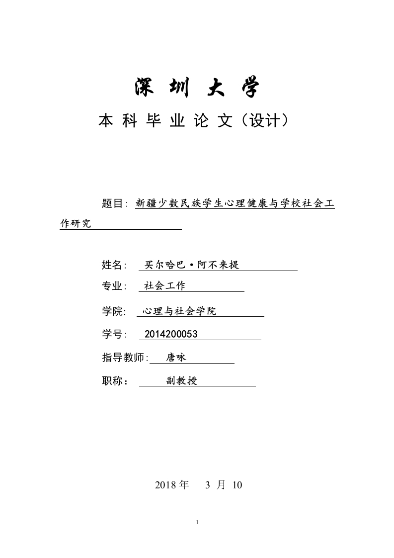 深圳大学本科毕业论文(设计)题目:新疆少数民族学生心理健康与学校社会工作研究姓名:买尔哈巴·阿不来提专业:社会工作学院:心理与社会学院学号:2014200053指导教师:唐咏职称:2018年3月101深圳大学本科毕业论文(设计)诚信声明本人郑重声明:所呈交的毕业论文(设计),题目《新疆少数民族学生心理健康与学校社会工作研究》是本人在指导教师的指导下,独立进行研究工作所取得的成果。对本文的研究做出重要贡献的个人和集体,均已在文中以明确方式注明。除此之外,本论文不包含任何其他个人或集体已经发表或撰写过的作品成果。本人完全意识到本声明的法律结果。毕业论文(设计)作者签名:买尔哈巴·阿不来提日期:2018年3月10日目录中文摘要和英文关键词…56(一)研究背景..(二)研究意义.(一)重要概念界定..7(二)外文文献..10四、研究资料分析…11(一)少数民族专职生心理健康素质的性别差异分析.·11(三)文科与理科少数民族专职生心理健康素质的差异分析..·12(四)不同家庭经济收入专职生心理健康素质的差异分析..13五、新疆少数民族专职生心理健康问题形成的原因.........14(一)少数民族专职生身心素质发展与大环境不适应..·14(二)教育价值观的不健全...六、促进新疆专职学校少数民族学生心理健康发展的策略,16(一)增强对新疆专职学校少数民族学生的心理健康教育........16(二)增强素质教育..16(三)帮扶家庭经济困难学生.·3