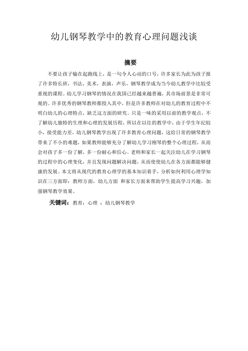 幼儿钢琴教学中的教育心理问题浅谈摘要不要让孩子输在起跑线上,是一句令人心动的口号,许多家长为此为孩子报了许多特长班,书法,美术,表演,声乐,钢琴教学成为当今幼儿教学中比较受重视的课程。幼儿学习钢琴的情况在我国已经越来越普遍,其市场前景是非常可观的。许多优秀的钢琴教师都投入其中,但是许多教师在对幼儿的教育过程中不明白幼儿的心理特点,缺乏这方面的研究。只是一味的采用以前的教学观点,不了解幼儿独特的生理和心理的发展历程,所以在以往的教学中,由于学生年纪较小,接受能力差,幼儿钢琴教学出现了许多教育心理问题,这给日常的钢琴教学带来了不小的难题,如果教师能够充分了解幼儿学习刚琴的整个心理过程,从而会对孩子多一份了解,多一份耐心和信心。老师和家长一起关注幼儿在学习钢琴的过程中的心理变化,并且发现问题解决问题,从而使使幼儿在各方面都能够健康的发展。本文将从现代的教育心理学的基本知识着手,分析如何利用心理学知识在三方面即:教师方面,幼儿方面和家长方面来帮助学生提高学习兴趣,加强钢琴教学效果。关键词:教育:心理;幼儿钢琴教学目录一、幼儿学习钢琴过程中出现的教育心理问题.33(二)急躁性4(三)紧张性二、幼儿钢琴教学中教育心理问题的产生根源…(二)学琴幼儿自身因素…(三)教师因素.6三、解决幼儿心理问题的建议67(二)学琴幼儿习惯的培养(三)家长在幼儿练琴方面应该注意事项.8参考文献一、幼儿学习钢琴过程中出现的教育心理问题每一个父母对孩子的未来都充满了希望,倾尽所能把想把世界上最好的事物给孩子,其中让父母最关注的就是孩子的教育问题,望子成龙,望女成凤是每个父母的心愿。伴随着现代社会的不断发展,现在越来越多的家长不仅仅只是关心孩子道德的培养和知识的提高,对于孩子的各方面能力教育也是越来越重视,在幼儿时期就培养孩子的才艺,这在幼儿教育中占很大成分。因为在学习钢琴的过程中能够陶治情操、锻炼意志并且增强自信心,所以现在成为越来越多的幼儿和家长的选择对象。孩子在学习钢琴过程中,往往需要突破自我,将自身的心理状态向自我表现的方向发展,在这一过程中更能激发孩子的学习热情,使孩子的性格变得开朗、活泼。在现阶段幼儿钢琴教学中存在一些问题,只有解决这些问题,幼儿才能在学习钢琴的道路上不断前行。(一)盲目性1.家长的盲目性在中国的音乐家里钢琴王子郎朗和李云迪作为年轻一代的代表人物征服了世界乐坛,同时也征服了中国的亿万年轻家长,使其成为自己孩子未来的目标。越来越多的中国家长相信自己的孩子也应该像朗朗一样有个钢琴童年。现在学习钢琴的孩子当中有许多人并不明白自己为什么学习钢琴。有些是因为家长赶时髦,有些是因为攀比,有些是望子成“师”的,还有些为了升学加分强迫孩子学的,还有为了考级的。因为这些原因来让孩子学习钢琴往往适得其反,是有害的。只有家长们对孩子学习钢琴有科学的态度,有正确的目标,我们才能正确的引导孩子学习,才能使孩子取得更好的学习成果和乐趣。2.幼儿的盲目性在接触钢琴的开始阶段,幼儿总是新奇的,钢琴就像是一个能够发出美妙声音的大玩具,让孩子在刚开始时有很浓厚的兴趣,但幼儿的自制力较差,兴趣点多又对钢琴的学习强度和难度不了解,因此很容易出现没兴趣,不想学习,半途而废的现象。这在学习钢琴的队伍中占很大一部分。
