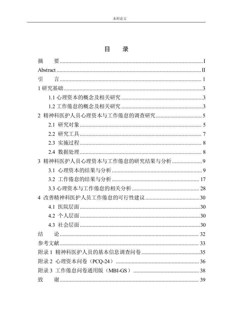 本科论文目录摘要Abstract引言…1研究基础311心理资本的概念及相关研究31.2工作倦怠的概念及相关研究32精神科医护人员心理资本与工作倦怠的调查研究52.1研究对象2.2研究工具444444444444444472.3实施过程82.4数据处理83精神科医护人员心理资本与工作倦怠的研究结果与分析93.1心理资本的结果与分析.93.2工作倦怠的结果与分析173.3心理资本与工作倦怠的相关分析284改善精神科医护人员工作倦怠的可行性建议.304.1医院层面304.2个人层面304.3社会层面30结论3233附录1精神科医护人员的基本信息调查问卷.35附录2心理资本问卷(PCQ-24)36附录3工作倦怠问卷通用版(MBI-GS)38致谢39本科论文摘要本文以晋中市心理卫生中心的精神科医护人员为例,选用Luthans的心理资本问卷(PCQ24)、工作倦怠问卷通用版(BIGS)两种问卷,对150名精神科医护人员的心理资本状况和工作倦怠状况进行调查,结果显示,精神科医护人员心理资本的得分大部分比较高,而工作倦怠的得分相对较低,在不同维度上均呈现不同程度的倦怠现象。根据皮尔逊的积差相关发现心理资本与工作倦怠有着负向相关的关系。具体表现在心理资本的自我效能、乐观和韧性三个维度的差异上,提升精神科医护人员自我效能感,培养乐观的心态以及锻炼其工作韧性可以缓解精神科医护人员的工作倦怠问题。精神科医护人员比其他行业员工的工作更加特殊,工作内容则是面对特殊的具有精神障碍的人群,这大大加剧了他们的工作倦怠。心理资本是积极的,他可以帮助个人心理成长,提升个人的工作效率和工作积极性,从而改善其工作倦怠的问题。运用合理的培训方式正确引导培养精神科医护人员具有较高的心理资本,让医护人员对工作任务产生兴趣。根据调查结果可以有目的性地缓解精神科医护人员的工作倦怠,并给予适当的建议和策略。关键词:心理资本;工作倦怠;精神科;医护人员本科论文AbstractThis article takes psychiatric medical staff in Jinzhong Mental HealthCenter as an example,selects Luthans psychological capital questionnaire(PCQ-24)and work burnout questionnaire general version (MBI-GS)two kindsof questionnaires.The psychological capital and job burnout were investigated.The results showed that the mental capital scores of psychiatric medical staffwere relatively high,while the job burnout score was relatively low,showingdifferent degrees of burnout in different dimensions.According to Pearson'scumulative difference correlation,psychological capital and job burnout have anegative correlation.This is manifested in the differences in the threedimensions of self-efficiency,optimism and resilience of psychological capital.Improving the self-efficacy of psychiatric medical staff,cultivating an optimisticattitude and exercising their work resilience can alleviate the job burnout ofpsychiatric medical staff.Psychiatric health care workers have jobs that are more specific than thosein other professions,dealing with a specific group of people with mentaldisorders,which can exacerbate job burnout.Psychological capital is positive,itcan help individual psychological growth,improve individual work efficiencyand work enthusiasm,so as to improve their job burnout.The use of reasonabletraining methods to properly guide the training of psychiatric medical staff has ahigh psychological capital,so that medical staff to work on the task of interest.According to the survey results,job burnout of psychiatric medical staff can bealleviated purposefully,and appropriate Suggestions and strategies can be given.Keywords:psychological capital;job burnout;psychiatry;medical staff
