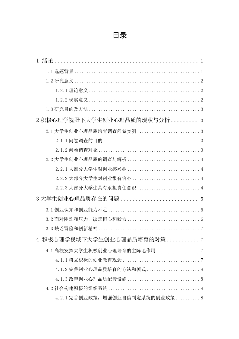 目录2积极心理学视野下大学生创业心理品质的现状与分析.·.···32.1大学生创业心理品质培育调查问卷实测....…32.1.2问卷调查对象…32.2大学生创业心理品质的调查与解析....2.2.1大部分大学生对创业感兴趣..2.2.2大部分大学生对创业很有信心..3.3缺乏冒险和创新精神...4积极心理学视域下大学生创业心理品质培育的对策.··74.1.2完善创业心理品质培育的方法和模式…84.2社会构建积极的组织系统.…84.2.1完善创业政策,增强创业自信制定系统的创业政策.·...84.2.2加大对大学生创业的支持力度….94.3家庭在大学生创业心理品质培育中发挥基础作用..…94.3.1转变就业观念,培养积极创业心理品质..........104.3.2提升创业信心,培养子女积极乐观的生活态度.......1044大学生加强自身的创业心理品质培育…114.4.2准确认识创业心理品质,培养积极人格.…12结论积极心理学理念在大学生创业教育中的应用卢家瑜摘要:本文可划分成四个板块。首先第一板块是绪论,主要点出选择本题的理由和意义,然后对于研究目的和方法进行梳理。第二板块主要是对大学生创业心理品质问卷调查的数据进行分析整理,在整理分析过程中揭示当代大学生的创业心理品质情况及积极心理学对于大学生创业观念转变影响等问题进行分析。第三板块是解决方法和问题反应,根据存在的问题来讨论大学生创业教育当中,积极心理在创业教育当中的作用,并且讨论家庭、社会、学校对于大学生创业心理品质教育的影响。全文主要围绕积极心理学于创业教育的发展进行讨论及分析,搭建在积极心理学视角下的创业教育培养,提高教育理念与心理学理论的融合度,为创业教育提供新想法。关键词:积极心理:大学生;创业教育