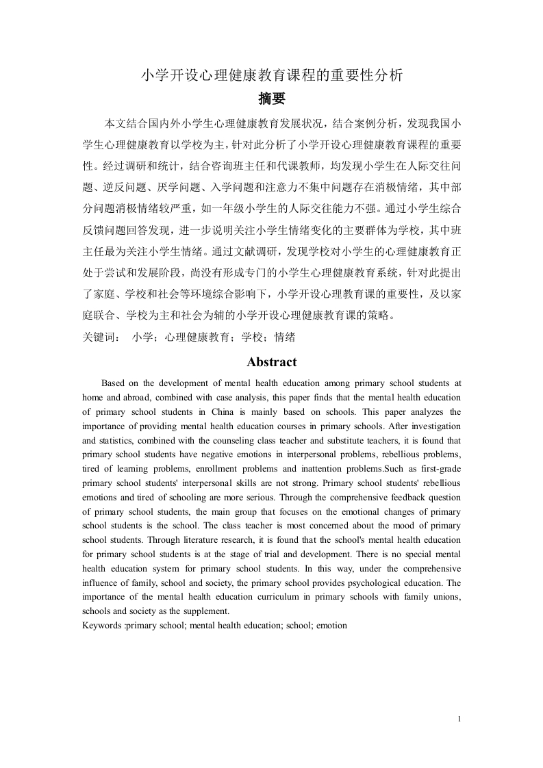 小学开设心理健康教育课程的重要性分析摘要本文结合国内外小学生心理健康教育发展状况,结合案例分析,发现我国小学生心理健康教育以学校为主,针对此分析了小学开设心理健康教育课程的重要性。经过调研和统计,结合咨询班主任和代课教师,均发现小学生在人际交往问题、逆反问题、厌学问题、入学问题和注意力不集中问题存在消极情绪,其中部分问题消极情绪较严重,如一年级小学生的人际交往能力不强。通过小学生综合反馈问题回答发现,进一步说明关注小学生情绪变化的主要群体为学校,其中班主任最为关注小学生情绪。通过文献调研,发现学校对小学生的心理健康教育正处于尝试和发展阶段,尚没有形成专门的小学生心理健康教育系统,针对此提出了家庭、学校和社会等环境综合影响下,小学开设心理教育课的重要性,及以家庭联合、学校为主和社会为辅的小学开设心理健康教育课的策略。关键词:小学;心理健康教育:学校:情绪AbstractBased on the development of mental health education among primary school students athome and abroad,combined with case analysis,this paper finds that the mental health educationof primary school students in China is mainly based on schools.This paper analyzes theimportance of providing mental health education courses in primary schools.After investigationand statistics,combined with the counseling class teacher and substitute teachers,it is found thatprimary school students have negative emotions in interpersonal problems,rebellious problems,tired of leaming problems,enrollment problems and inattention problems.Such as first-gradeprimary school students'interpersonal skills are not strong.Primary school students'rebelliousemotions and tired of schooling are more serious.Through the comprehensive feedback questionof primary school students,the main group that focuses on the emotional changes of primaryschool students is the school.The class teacher is most concemed about the mood of primaryschool students.Through literature research,it is found that the school's mental health educationfor primary school students is at the stage of trial and development.There is no special mentalhealth education system for primary school students.In this way,under the comprehensiveinfluence of family,school and society,the primary school provides psychological education.Theimportance of the mental health education curriculum in primary schools with family unions,schools and society as the supplement.Keywords primary school;mental health education;school;emotion目录1国内外小学心理健康问题关注度1.1国外小学生心理健康教育情况1.2国内小学生心理健康教育情况22案例分析32.1案例分析方法2.1.1随机抽样法.2.1.3统计处理42.2结果42.2.1小学生情绪调查结果42.1.2各年级小学生情绪消极率特征分析2.3小结73讨论.3.1校家联合开展小学生心理健康教育83.1.1家庭环境对小学生心理健康的影响…3.1.2校家联合开展小学生心理健康教育对策3.2学校为主的小学生心理健康教育对策3.2.1学校环境对小学生心理健康的影响3.2.2学校环境进行小学生心理健康教育对策.103.3社会为辅的小学生心理健康教育对策113.3.1学校环境对小学生心理健康的影响.3.3.2社会为辅的小学生心理健康教育对策112前言在经济压力持续递增的背景下,当代青年人的思想观念也发生根本的变化。现在青年夫妻对自身生活质量要求越来越高,经济压力也越来越大,为了降低这种压力和为下一代提供一个优越的生活环境,因此他们一般养1-2个孩子。这样小学生的成长备受家里长辈关注,家里长辈尽力满足孩子物质和精神需求。小学生的心智正处于发育期,心理承受压力非常脆弱。小学生因家庭、学校和社会环境中出现的激变时间,都可能出现心理问题。如家庭父母离异或去世,老师批评或同学孤立,社会大事件地震、洪涝和火灾等发生,可使小学生产生抑郁、害怕、孤独、厌倦和逃避等心理。这些心理问题不得到及时处理,小学生必表现出消极或偏激行为如逃避、叛逆和暴躁等,影响孩子身心健康发育。针对此,家庭、学校和社会都有必要关心小学生心理健康问题,有义务对小学生的心理问题正确引导和展开心理健康教育。如何有效的对小学生的心理问题正确引导和展开心理健康教育,是国内外普遍关注的问题。但这个问题的解决,首先需要了解小学生存在哪些心理问题,以及产生心理问题的因素是什么,才可有目的通过疏导和教育的方式消除小学生的心理问题,实现小学生健康成长。针对解决小学生心理问题的重要性,笔者通过文献查阅、网络调研和走访方式,了解到目前小学生出现心理问题的主要因素就是对其情绪变化关心不够,没有采取正确的方法帮助小学生解决问题。如小学生成绩不好时,大多数家长主要采取批评的方法,这样孩子对学习的兴趣就容易降低。疏导小学生心理问题在小学生心理健康教育上如此的重要,家庭、学校和社会应该寻求正确方法对小学生心理问题进行疏导。大部分学者认为学校是小学生的集合体,学校应该开办心理健康教育课程辅助小学生解决各种心理问题,对小学生展开心理健康教育。如中国新闻网(2012年1月6日)全国政协委员刘蕾提议应将“性健康教育”列为中小学校的必修课。针对此,本文将对小学是否开设心理健康教育课程,小学开设心理健康教育课的重要性以及如何开展心理健康教育课展开分析本文对国内外对国内外小学生的心理健康问题关注度调研,分析了国内外小学生心理健康教育的有