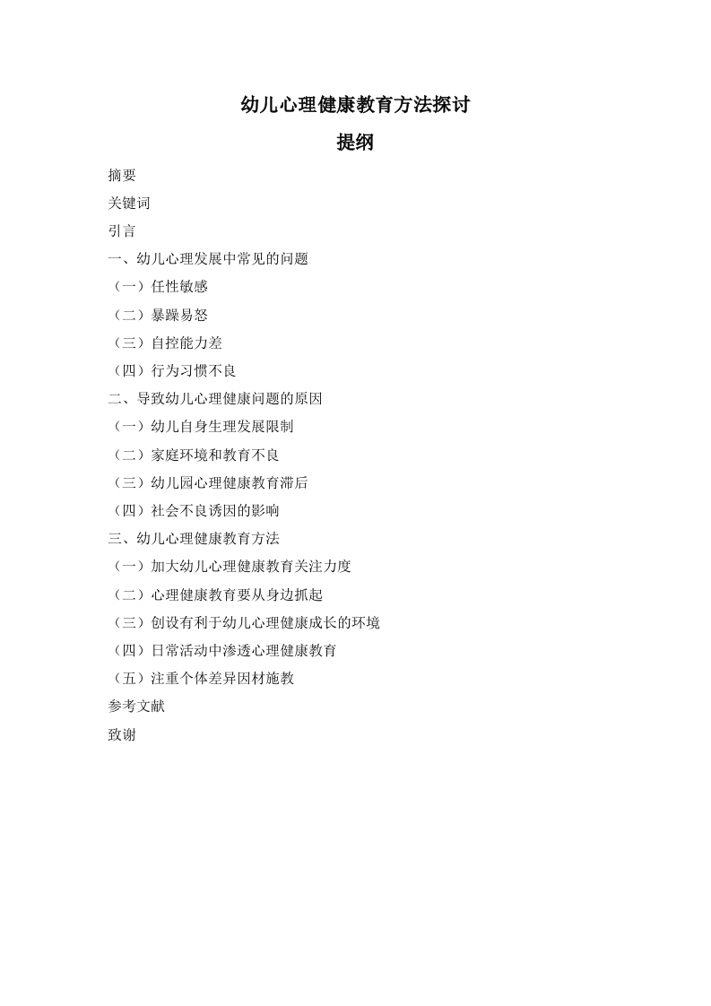 幼儿心理健康教育方法探讨提纲摘要关键词引言一、幼儿心理发展中常见的问题(一)任性敏感(二)暴躁易怒(三)自控能力差(四)行为习惯不良二、导致幼儿心理健康问题的原因(一)幼儿自身生理发展限制(二)家庭环境和教育不良(三)幼儿园心理健康教育滞后(四)社会不良诱因的影响三、幼儿心理健康教育方法(一)加大幼儿心理健康教育关注力度(二)心理健康教育要从身边抓起(三)创设有利于幼儿心理健康成长的环境(四)日常活动中渗透心理健康教育(五)注重个体差异因材施教参考文献致谢