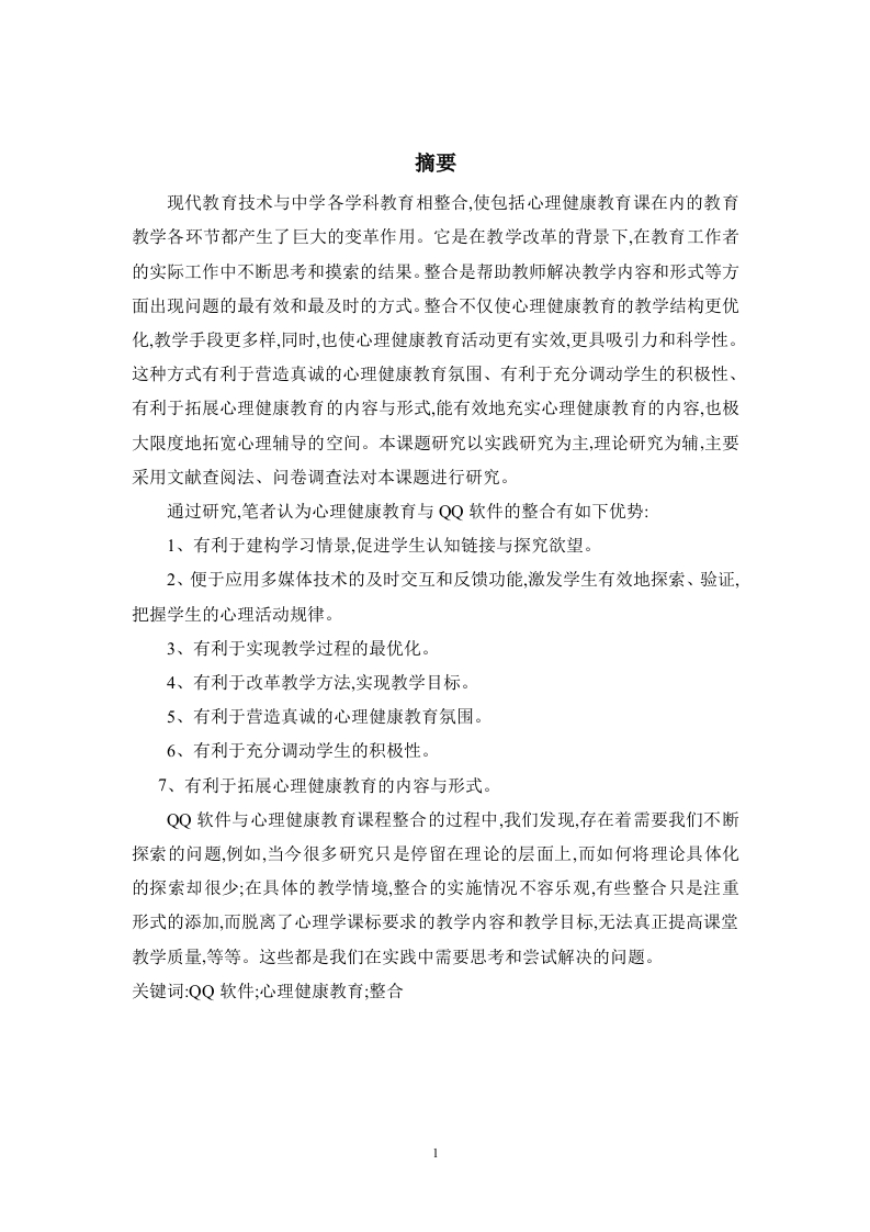 摘要现代教育技术与中学各学科教育相整合,使包括心理健康教育课在内的教育教学各环节都产生了巨大的变革作用。它是在教学改革的背景下,在教育工作者的实际工作中不断思考和摸索的结果。整合是帮助教师解决教学内容和形式等方面出现问题的最有效和最及时的方式。整合不仅使心理健康教育的教学结构更优化,教学手段更多样,同时,也使心理健康教育活动更有实效,更具吸引力和科学性。这种方式有利于营造真诚的心理健康教育氛围、有利于充分调动学生的积极性、有利于拓展心理健康教育的内容与形式,能有效地充实心理健康教育的内容,也极大限度地拓宽心理辅导的空间。本课题研究以实践研究为主,理论研究为辅,主要采用文献查阅法、问卷调查法对本课题进行研究。通过研究,笔者认为心理健康教育与QQ软件的整合有如下优势:1、有利于建构学习情景,促进学生认知链接与探究欲望。2、便于应用多媒体技术的及时交互和反馈功能,激发学生有效地探索、验证,把握学生的心理活动规律。3、有利于实现教学过程的最优化。4、有利于改革教学方法,实现教学目标。5、有利于营造真诚的心理健康教育氛围。6、有利于充分调动学生的积极性。7、有利于拓展心理健康教育的内容与形式。QQ软件与心理健康教育课程整合的过程中,我们发现,存在着需要我们不断探索的问题,例如,当今很多研究只是停留在理论的层面上,而如何将理论具体化的探索却很少:在具体的教学情境,整合的实施情况不容乐观,有些整合只是注重形式的添加,而脱离了心理学课标要求的教学内容和教学目标,无法真正提高课堂教学质量,等等。这些都是我们在实践中需要思考和尝试解决的问题。关键词:QQ软件:心理健康教育:整合1目录引言3(一)研究背景3(二)研究意义(三)相关的研究概述8二、相关概念界定14(一)信息技术与课程整合..14(三)QQ心理咨询15三、相关理论概述15(一)高中心理健康课程的教与学的理论.(二)教育技术的理论.16(三)高中心理健康教育课程与QQ软件整合的理论与方法.17四、QQ软件在高中心理健康教育中的应用情况.18(一)高中心理健康教育课程的分析18(二)心理健康教育课程的特点…20(三)某某中学心理健康教育课程的教学模式分析.20(四)如何运用QQ软件对高中生进行心理健康教育.21(五)整合点分析与技术应用.….24(六)QQ软件在心理教学中的应用.26(七)QQ软件在心理咨询中的应用.27(八)QQ应用于教育教学的几点质疑(九)案例分析.2930参考文献.…附录引言1.时代背景中国教育部在《关于在中小学普及信息技术教育的通知》中明确提出了信息技术与各学科课程整合的概念,并决定在中学和小学里,(一)研究背景从21年开始,用5一1年的时间,普及信息技术教育,通过普及信息技术教育,而使中小学的教育现代化,跟上时代发展的步伐,为实现基础教育的发展做出努力。陈至立,原国家教育部部长在全国中小学信息技术教育的工作会议上提出了普及信息技术教育的要求。陈至立提出:不仅要开设信息技术教育的相关课程,还要将信息技术教育与其它课程的教育相结合,把信息技术应用在其它学科教育中,学生在学习其它学科知识时,也融入信息技术的教育。对于中学学科的教育教学而言,实施素质教育的前提是必须对每个学生内在能动因素进行研究和分析,确认每个学生个性的优劣及发展趋势。在此基础上,施加相应的教育,开发与调动学生的能动因素,以求得素质教育的实效。正因如此,心理健康教育已成为现代学校教育的一个重要标志。正基于中学学科教学改革的大方向和中学心理健康教育的重要性,作为高中心理健康教育工作者,不得不思考与探索顺应时代发展的中学心理健康教育的新模式,同时尝试把信息技术应用到心理健康教育的各方面,这也是本文的主旨所在。2.中学心理健康教育教学改革背景中小学心理健康教育是根据中小学生生理,心理发展特点,运用有关心理教育方法和手段,培养学生良好的心理素质,促进学生身心全面和谐发展和素质全面提高的教育活动,是素质教育的重要组成部分,自理健康教育在中学学科教学中起到至关重要的作用,中学心理健康教育教学的改革迫在眉睫。现代教育技术与心理健康教育的整合,即在心理健康教育中渗透现代教育技术,实质是在网络环境下建构学习环境,把现代信息技术与心理健康教育教学内容的有机结合,共同完成一定的教学任务的一种新型教学方式。在现代教育技术和心理健康教育的普遍得到重视并应用到了现实教学行动的背景下,使心理健康教育与信息技术相整合的研究无论是在心理健康教育领域还是信息技术在教学中的应用领域,在各级学校开展,这不仅使心理健康教育的教学结构更优化,教学手段更多样,更具时代特色,也使心理健康教育活动更有实效性。这种方式有利于改3