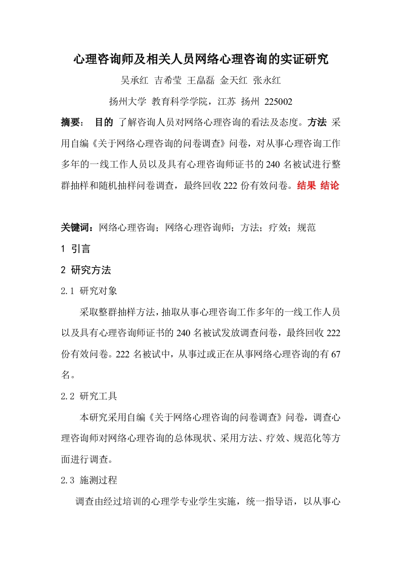 心理咨询师及相关人员网络心理咨询的实证研究吴承红吉希莹王晶磊金天红张永红扬州大学教育科学学院,江苏扬州225002摘要:目的了解咨询人员对网络心理咨询的看法及态度。方法采用自编《关于网络心理咨询的问卷调查》问卷,对从事心理咨询工作多年的一线工作人员以及具有心理咨询师证书的240名被试进行整群抽样和随机抽样问卷调查,最终回收222份有效问卷。结果结论关键词:网络心理咨询;网络心理咨询师;方法;疗效;规范1引言2研究方法2.1研究对象采取整群抽样方法,抽取从事心理咨询工作多年的一线工作人员以及具有心理咨询师证书的240名被试发放调查问卷,最终回收222份有效问卷。222名被试中,从事过或正在从事网络心理咨询的有67名。2.2研究工具本研究采用自编《关于网络心理咨询的问卷调查》问卷,调查心理咨询师对网络心理咨询的总体现状、采用方法、疗效、规范化等方面进行调查。2.3施测过程调查由经过培训的心理学专业学生实施,统一指导语,以从事心理咨询工作多年的一线工作人员和有心理咨询师证书的群体为对象,问卷当场回收。2.4统计工具用SPSS17.0对整理出的数据进行统计处理。3结果与分析3.1网络心理咨询总体现状3.1.1网络心理咨询师工作状况的调查通过调查发现,在心理从业人员中有咨询师证书的只有28.4%,而没有证书的占了大部分,达到71.6%。在从业的心理人员中有网络咨询经验的占了302%,没有接触过网络咨询的占了大部分,达到69.8%。在有网络咨询经验的的人员中使用的咨询平台也不一样,使用QQ等即时聊天工具的占了约54%,使用可靠专业的网站的占了41%,还有5%的咨询师使用邮件的形式。(见表1)表1网络心理咨询师工作状况的调查人数百分比(%)有无咨询师证有6328.4无15971.6网络咨询经验未接触15569.81-3年5625.23-5年52.35年以上2.7咨询平台QQ等即时聊天工具12054可靠专业的网站9141邮件1153.1.2网络咨询师对网络咨询基本态度的调查通过对222名心理咨询师的调查发现,其中有171名认为网络咨询是一种很好的新型心理咨询方式,占了总调查者的77%,而11.3%的调查者认为在网络上进行心理咨询容易遭人误解,有一小部分的受访者则认为网络心理咨询没有很大用处,占了总数的4.1%,其余的受访者则表示无所谓。(见表2)表2网络咨询师对网络咨询的基本态度人数百分比(%)很好17177.0会受人误会25113没多大用处94.1无所谓177.73.1.3网络咨询交流形式的调查在调查中发现,网络心理咨询师采用“文字形式”与来访者进行咨询占56.7%;也有相当一部分的咨询师采用“文字与语音”相结合的形式进行咨询,这样的咨询师占28.4%;而运用“视频”进行咨询的只有1.5%的咨询师;这三种方法同时使用的咨询师却占13.4%。(见表3)表3网络咨询交流形式人数百分比(%)文字形式3856.7文字+语音1928.4视频交流1.5三种同时使用13.43.2网络心理咨询使用方法的调查通过对这些咨询师的调查,发现:在网络上进行心理咨询普遍采用的方法为认知疗法和意象对话,分别为58.2%、34.3%;而催眠疗法与行为疗法则被采用的很少,分别只占1.5%、3.0%:还有3%的咨询师采用其他疗法。(见表4)