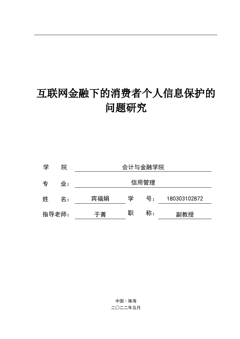 互联网金融下的消费者个人信息保护的问题研究学院会计与金融学院专业:信用管理姓名:宾福娟学180303102872指导老师:于菁职称:副教授中国·珠海二O二二年五月北京理工大学珠海学院2022届本科生毕业论文诚信承诺书本人郑重承诺:我所呈交的毕业论文《互联网金融下的消费者个人信息保护的问题研究》是在指导教师的指导下,独立开展研究取得的成果,文中引用他人的观点和材料,均在文后按顺序列出其参考文献,论文使用的数据真实可靠。承诺人签名:日期:年月日北京理工大学珠海学院2022届本科生毕业论文互联网金融下的消费者个人信息保护的问题研究摘要随着大数据时代的到来,信息技术的快速发展,促进了传统金融行业与互联网的结合,互联网金融给消费者带来了不一样的消费方式,带来便利的同时,也产生了消费者个人信息泄露,被非法利用等问题,严重损害消费者的隐私权。传统的隐私权理论已不能互联网金融消费者的信息权利提供充分的理论保证,加之我国互联网金融消费者个人信息权法律保护不健全,行业监管不规范,使得互联网金融消费者个人信息权处于安全隐患中。因此,本文对我国现阶互联网金融消费者个人信息存在问题进行研究,先分析了我国当前法律保护的现状,然后分析了消费者个人信息保护的困境,还借鉴了发达国家的经验,最后从完善法律法规,加强监管和行业自律,提升互联网信息安全技术,提高信息保密意识,建立线上解决纠纷机制等方面寻求保护措施,力求全面保护互联网金融消费者的个人信息权。关键词:互联网金融:消费者信息保护:信息权