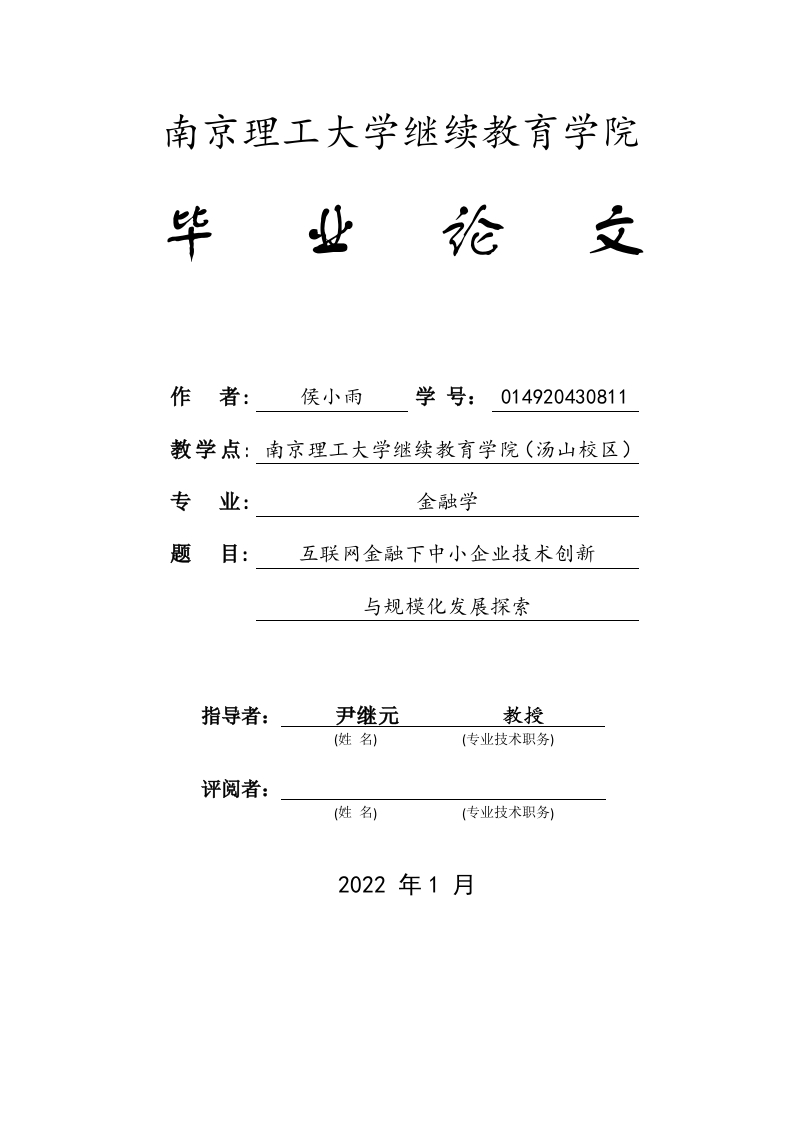 南京理工大学继续教育学院毕业论作者:侯小雨学号:014920430811教学点:南京理工大学继续教育学院(汤山校区)专业:金融学题目:互联网金融下中小企业技术创新与规模化发展探索指导者:尹继元教授(姓名)(专业技术职务)评阅者:(姓名)(专业技术职务)2022年1月声明我声明,本毕业论文及其研究工作和所取得的成果是本人在导师的指导下独立完成的。研究过程中利用的所有资料均已在参考文献中列出,其他人员或机构对本毕业论文工作做出的贡献也已在致谢部分说明。本毕业论文不涉及任何秘密,南京理工大学继续教育学院有权保存其电子和纸质文档,可以借阅或网上公布其部分或全部内容,可以向有关部门或机构送交并授权保存、借阅或网上公布其部分或全部内容。学生签名:年月日指导教师签名:年月日毕业论文中文摘要摘要:随着我国移动端和互联网以及互联网金融的快速深入发展发展,我国中小企业的未来经济发展已经受到越来越多的人关注,在国民经济中占有越来越重要的地位。企业的技术创新能力在推动我国中小企业和未来经济发展中起着举足轻重的作用,而创新型人才是支撑企业的提高技术创新能力、发展就业能力的中坚力量。本文从中小企业技术创新与规模化的含义和意义出发,结合金融中小企业的发展现状,分析中小企业技术创新的出现的原因和形成的内容,了解企业技术创新在发展过程中可能出现的问题,并提出解决这些问题的措施和策略,从而促进我国中小企业的进一步发展。关键词中小企业技术创新创新型人才互联网金融
