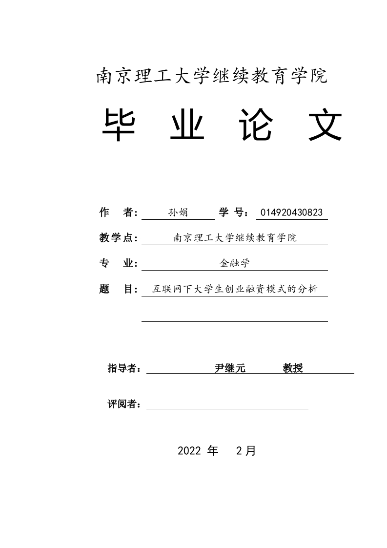 南京理工大学继续教育学院毕业论文作者:孙娟学号:014920430823教学点:南京理工大学继续教育学院专业:金融学题目:互联网下大学生创业融资模式的分析指导者:尹继元教授评阅者:2022年2月声明我声明,本毕业论文及其研究工作和所取得的成果是本人在导师的指导下独立完成的。研究过程中利用的所有资料均已在参考文献中列出,其他人员或机构对本毕业论文工作做出的贡献也己在致谢部分说明。本毕业论文不涉及任何秘密,南京理工大学继续教育学院有权保存其电子和纸质文档,可以借阅或网上公布其部分或全部内容,可以向有关部门或机构送交并授权保存、借阅或网上公布其部分或全部内容。学生签名:孙娟2022年月日指导教师签名:2022年月日毕业论文中文摘要摘要:毕业生的数量逐年增加,毕业生之间的竞争变得更加激烈,就业越来越困难。毕业生人数与就业岗位开始相继出现供大于求的情况。在这些压力下,许多毕业生走上了自主创业的道路。早在“十一五”期间,国家就已经出台了学生创业的相关政策,来鼓励大学生创业。现如今大学生创业越来越普遍,但是大学生自主创业也始终存在着许多问题。自身经验不足,政策宣传力度不足,融资体系不完善,高校创业教育不到位等这些都是大学生不能成功融资的原因。为了优化大学生的创业环境,解决大学生创业融资难的问题,可以从这五个方面着手,一,大学生自身加强知识和创业教育,二,政府加强宣传并完善创业相关政策,三,改善大学生创业融资环境四,大学生创业的金融创新五,加强学校的创新创业教育培训。如此,大学生的创业道路才能更为顺畅。关键词:互联网大学生创业互联网金融创业融资