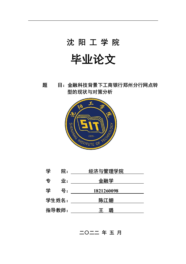 沈阳工学院毕业论文题目:金融科技背景下工商银行郑州分行网点转型的现状与对策分析1999学院:经济与管理学院专业:金融学学号:1821260098学生姓名:陈江姗指导教师:王璐独创性声明本人声明,所呈交的学位论文是在导师的指导下进行研究工作所取得的成果。尽我所知,除文中己经注明引用内容和致谢的地方外,论文中不包含其他人己经发表或撰写过的研究成果,也不包括本人为获得其他学位而使用过的材料。与我一同工作的同志对本研究所做的任何贡献均己在论文中做了明确的说明并表示了谢意。学位论文作者签名:陈江姗签字日期:年月日学位论文版权使用授权书本学位论文作者完全了解沈阳工学院有关保留、使用学位论文的规定。特授权沈阳工学院可以将学位论文的全部或部分内容编入有关数据库进行检索,提供阅览服务,并采用影印、缩印或扫描等复制手段保存、汇编以供查阅和借阅。同意学校向国家有关部门或机构送交论文的复印件和磁盘。学校可以为存在馆际合作关系的兄弟高校用户提供文献传递服务和交换服务。(保密的学位论文在解密后适用本授权说明)学位论文作者签名:陈江姗导师签名:签字日期:年月日签字日期:年月日摘要近年来,在金融科技飞速发展的背景下,金融科技与传统网点快速融合,使得商业银行传统网点发展面临诸多问题。而作为未来银行业发展必然趋势,且在为不同用户提供丰富的金融产品以及良好的服务时,我国商业银行网点也应顺应时代趋势,总结发达国家商业银行智慧网点转型经验,积极采取相应措施加快商业银行网点智能化转型进程,从金融科技应用与转化、风险管理体系、智能机具分流、综合金融服务方面进行深层次改革,以更好地应对新时代下的挑战,逐渐形成各商业银行网点优势并提升自身竞争力。本文以工商银行郑州分行为例,通过访谈的形式对该地工商银行郑州分行的工作人员进行采访,从而聚焦金融科技发展给商业银行网点转型带来的影响,以分析当前该银行网点转型的现状以及必要性。首先,本文主要介绍了金融科技的概念、特点以及商业银行网点转型的意义:其次介绍了此次访谈的内容以及结果:之后根据访谈结果进而分析工商银行郑州分行当前网点转型的现状:最后主要针对郑州分行网点转型的现状提出相应的对策,从而提升商业银行整体核心竞争力。关键词:金融科技:网点转型:智能化