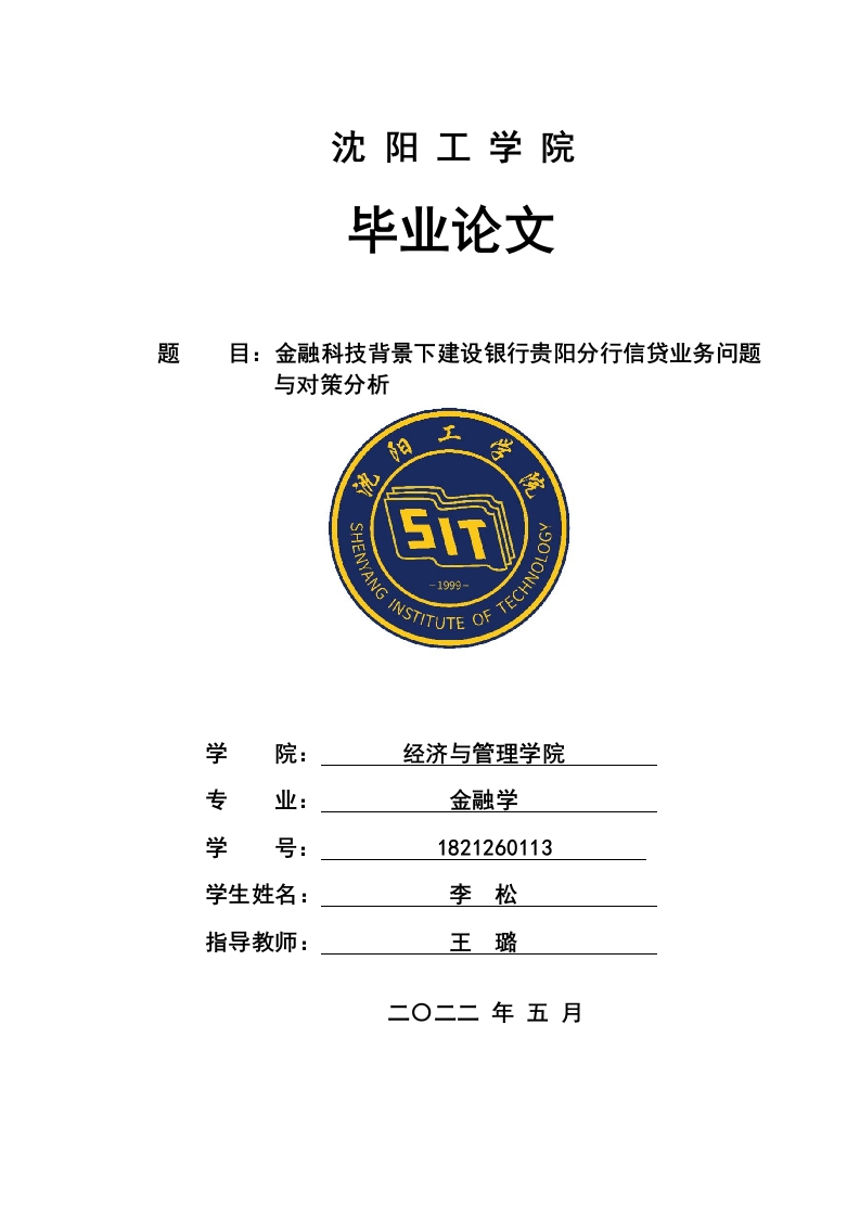 沈阳工学院毕业论文题目:金融科技背景下建设银行贵阳分行信贷业务问题与对策分析SHENYANG-1999学经济与管理学院专金融学学号:1821260113学生姓名:李松指导教师:王璐独创性声明本人声明,所呈交的学位论文是在导师的指导下进行研究工作所取得的成果。尽我所知,除文中己经注明引用内容和致谢的地方外,论文中不包含其他人己经发表或撰写过的研究成果,也不包括本人为获得其他学位而使用过的材料。与我一同工作的同志对本研究所做的任何贡献均已在论文中做了明确的说明并表示了谢意。学位论文作者签名:签字日期:年月日学位论文版权使用授权书本学位论文作者完全了解沈阳工学院有关保留、使用学位论文的规定。特授权沈阳工学院可以将学位论文的全部或部分内容编入有关数据库进行检索,提供阅览服务,并采用影印、缩印或扫描等复制手段保存、汇编以供查阅和借阅。同意学校向国家有关部门或机构送交论文的复印件和磁盘。学校可以为存在馆际合作关系的兄弟高校用户提供文献传递服务和交换服务。(保密的学位论文在解密后适用本授权说明)学位论文作者签名:导师签名:签字日期:签字日期: