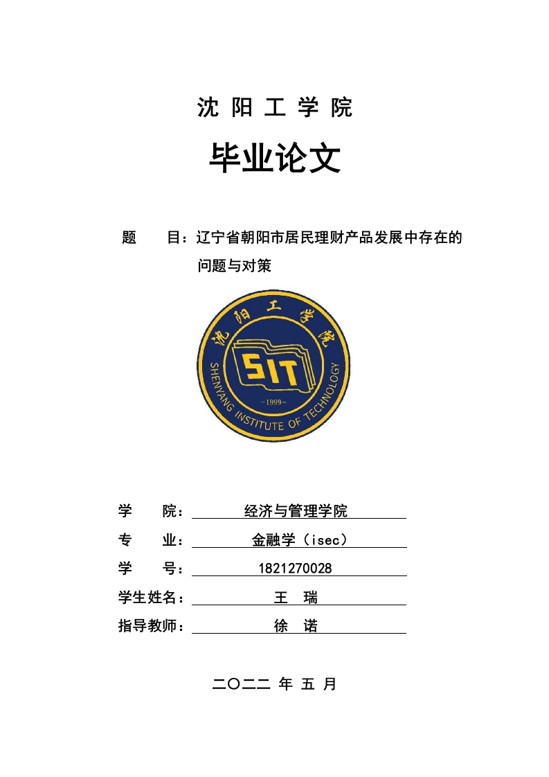 沈阳工学院毕业论文题目:辽宁省朝阳市居民理财产品发展中存在的问题与对策院E-1999-学经济与管理学院专业:金融学(isec)学号:1821270028学生姓名:王瑞指导教师:徐诺独创性声明本人声明,所呈交的学位论文是在导师的指导下进行研究工作所取得的成果。尽我所知,除文中已经注明引用内容和致谢的地方外,论文中不包含其他人已经发表或撰写过的研究成果,也不包括本人为获得其他学位而使用过的材料。与我一同工作的同志对本研究所做的任何贡献均己在论文中做了明确的说明并表示了谢意。学位论文作者签名:签字日期:年月日学位论文版权使用授权书本学位论文作者完全了解沈阳工学院有关保留、使用学位论文的规定。特授权沈阳工学院可以将学位论文的全部或部分内容编入有关数据库进行检索,提供阅览服务,并采用影印、缩印或扫描等复制手段保存、汇编以供查阅和借阅。同意学校向国家有关部门或机构送交论文的复印件和磁盘。学校可以为存在馆际合作关系的兄弟高校用户提供文献传递服务和交换服务。(保密的学位论文在解密后适用本授权说明)学位论文作者签名:导师签名:签字日期:年月日签字日期:年月日摘要随着我国经济的发展,理财产品发展速度逐渐提高,尤其是在丰富国内金融市场经济活力、吸收大量资金不断涌入资本市场等许多方面发挥着越来越重要的作用。但是国内理财产品的发展,相对国外,国内居民理财产品因为其市场发展不稳定、居民思想观念落后等原因,一直以来很难获得城镇居民对于理财产品的资金支持,甚至中国居民理财理念缺失严重影响着其理财产品发展。本文以辽宁省朝阳市居民理财产品的发展存在的问题进行研究,通过问卷调查等方式,查阅相关资料并结合文献资料,针对其居民理财产品发展过程中具体存在的问题进行分析,这些问题还普遍存在于其他地区的居民理财产品当中,影响是不利于朝阳及地区居民长期发展投资理财。后续主要针对这些问题提出相关对策,使得对策具有针对性,促使辽宁省朝阳市居民理财方式得到改进、理财产品持续稳定发展,还能对其他地区居民理财产品发展的完善具有一些借鉴意义。该文章主要改进对策如下:第一培养和树立正确的理财和选择理财产品观念、第二丰富居民个人理财产品优化投资产品组合、第三拓宽理财信息的获取渠道。最后居民理财产品发展在市场是具有很大的发展空间,但它所面临的问题依旧存在,希望这些改进措施能对后续研究居民理财产品的未来发展有微薄助益。关键词:城镇居民:理财方式:理财产品