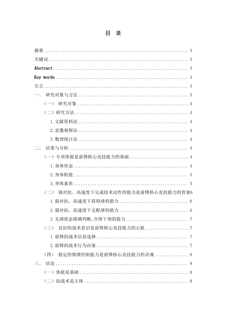 目录33Abstract3Key words.........3引言…3一、研究对象与方法3(一)研究对象1.文献资料法..42.录像观察法3.数理统计法.…4二、结果与分析.(一)专项体能是前锋核心竞技能力的基础..45(二)强对抗、高速度下完成技术动作的能力是前锋核心竞技能力的骨架6663.无球状态准确判断,合理干预的能力·71.前锋的战术信息选择7三、8(一)体能是基础...(二)技战术是主体...(三)心智是保证9参考文献:…9现代足球前锋运动员核心竞技能力Xxx专业学生学生姓名指导教师指导教师姓名摘要:足球运动员的竞技能力受到诸多因素影响,在足球运动员所有的竞技能力相关要素中,对足球运动员的运动成绩起决定作用的要素,我们把它称为足球运动员核心竞技能力,它比其他要素对足球运动员更为重要。文章对足球运动员中的一种位置上的运动员即前锋来展开研究,论述了其核心竞技能力。关键词:足球:前锋:核心竞技能力Core competitive ability of modern football forward athletesStudent majoring in xxxx NameTutorNameAbstract:Football Athletes'competitive ability is affected by many factors,in the competitiveability of football players of all the related elements,elements of athletic performance of soccerplayers play a decisive role,we call it the core competitive ability of football players,it is betterthan other elements of football players is more important.The paper studies the players in afootball player,that is,the striker,and discusses its core competitive ability.Key words:football football forward ;the core competitive ability of the football forward引言:一个优秀的世界级前锋应该具备哪些竞技能力呢?本文从竞技体育和运动训练学的角度,通过吸收前人的研究经验,借助现代发达的信息传播技术,了解世界高水平比赛中优秀前锋队员的表现,了解前锋队员的技术特点、身体素质、心理特点等方面,分析总结符合其自身特点的核心竞技能力,旨在能为我国足球前锋的培养、训练提供理论参考。一、研究对象与方法(一)研究对象当今世界足坛各大赛事中的35名优秀前锋。(二)研究方法