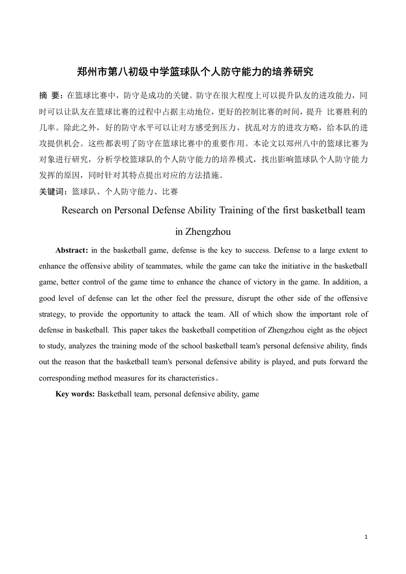 郑州市第八初级中学篮球队个人防守能力的培养研究摘要:在篮球比赛中,防守是成功的关键。防守在很大程度上可以提升队友的进攻能力,同时可以让队友在篮球比赛的过程中占据主动地位,更好的控制比赛的时间,提升比赛胜利的几率。除此之外,好的防守水平可以让对方感受到压力,扰乱对方的进攻方略,给本队的进攻提供机会。这些都表明了防守在篮球比赛中的重要作用。本论文以郑州八中的篮球比赛为对象进行研究,分析学校篮球队的个人防守能力的培养模式,找出影响篮球队个人防守能力发挥的原因,同时针对其特点提出对应的方法措施关键词:篮球队、个人防守能力、比赛Research on Personal Defense Ability Training of the first basketball teamin ZhengzhouAbstract:in the basketball game,defense is the key to success.Defense to a large extent toenhance the offensive ability of teammates,while the game can take the initiative in the basketballgame,better control of the game time to enhance the chance of victory in the game.In addition,agood level of defense can let the other feel the pressure,disrupt the other side of the offensivestrategy,to provide the opportunity to attack the team.All of which show the important role ofdefense in basketball.This paper takes the basketball competition of Zhengzhou eight as the objectto study,analyzes the training mode of the school basketball team's personal defensive ability,findsout the reason that the basketball team's personal defensive ability is played,and puts forward thecorresponding method measures for its characteristics.Key words:Basketball team,personal defensive ability,game目录31研究对象与方法1.1研究对象.…31.2研究方法..31.2.2问卷调查法31.2.3观察法....31.2.4数理统计法32研究结果与分析.…2.1郑州八中篮球队队员基本情况分析..2.1.1篮球队队员年龄与训练年限调查42.1.2郑州八中篮球队队员训练情况分析62.2.1防守具有攻击性.......62.2.2防守强调主动性、预见性和集体性2.2.3个人防守以球为主.....72.2.4重视对无球队员的防守..773.2篮球防守意识不高.·884.1加强篮球队队员对篮球意识的培养94.2完善篮球防守后备人才的培养机制..94.3提高教练员的综合素质的发展10总结10参考文献.1112132引言在快速成长的篮球场中,防守的作用使得越来越多的教练和球员意识到其重要性,对许多教练和球员也试图给他们带来痛苦和幸福。防守运动员消耗的攻击力不及攻击力,防守的训练需要每一个篮球运动员付出很多的努力和考验,在篮球运动中获得的人格魅力和精神对未来的工作学习具有很大的帮助,我国的篮球人才的培养中篮球文化起到了深远的影响。有更多关于篮球和技术研究水平的文章,但大多数篮球运动员几乎没有关于防守技术的文章。根据郑州中学篮球现状,以郑州八中篮球队防守能力和训练体系的科学系统调查为突破点,采取观察方法和问卷调查方法。研究重点是篮球运动员通过多层次,多角度训练措施探索篮球运动员的技能和解决方案的防御能力,努力扩大篮球防守技术,增强空间。
