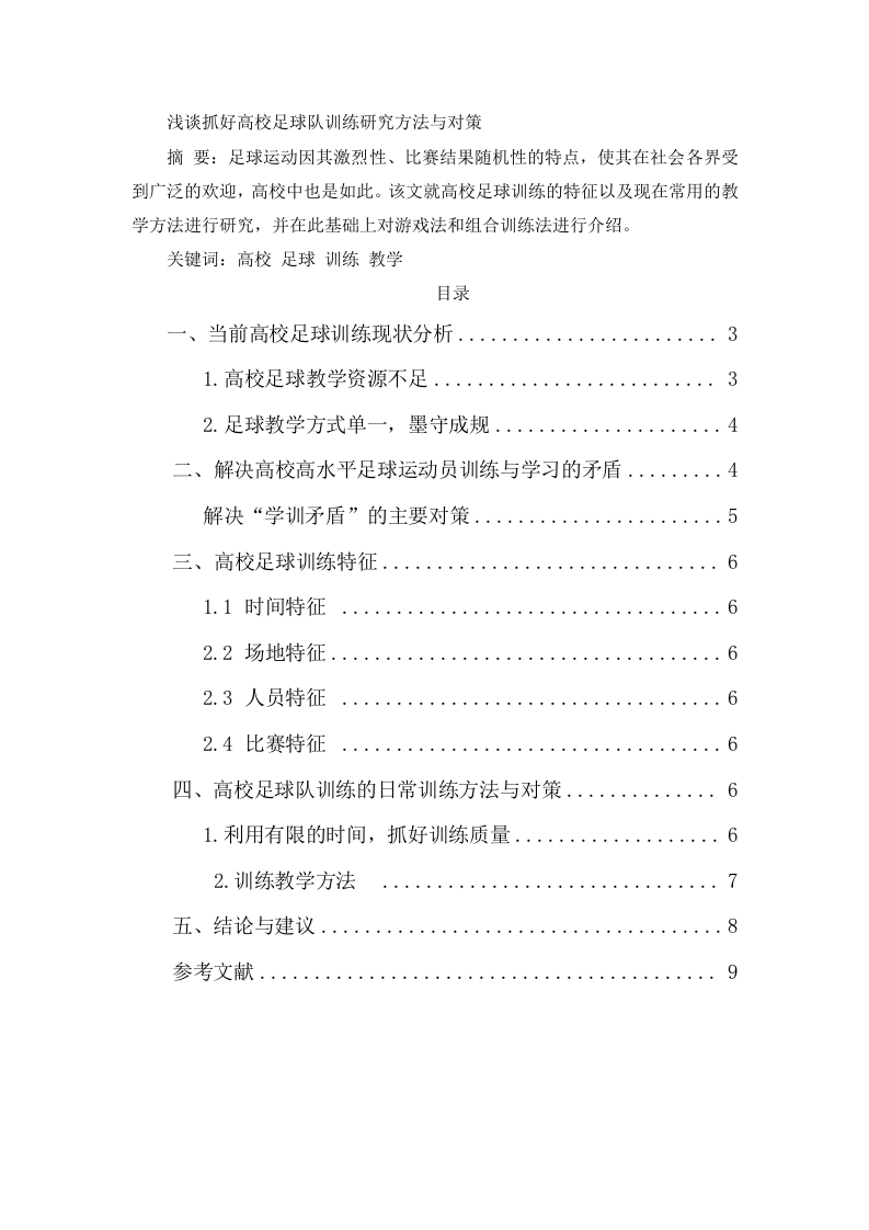 浅谈抓好高校足球队训练研究方法与对策摘要:足球运动因其激烈性、比赛结果随机性的特点,使其在社会各界受到广泛的欢迎,高校中也是如此。该文就高校足球训练的特征以及现在常用的教学方法进行研究,并在此基础上对游戏法和组合训练法进行介绍。关键词:高校足球训练教学目录一、当前高校足球训练现状分析..·1.高校足球教学资源不足..·.......二、解决高校高水平足球运动员训练与学习的矛盾.·..·4解决“学训矛盾”的主要对策....61.1时间特征2.2场地特征...62.3人员特征62.4比赛特征6四、高校足球队训练的日常训练方法与对策.··662.训练教学方法7参考文献.9一、当前高校足球训练现状分析(一)高校足球教学资源不足足球教学资源分为师资力量队伍、教材教具、教学设施投入等。当前高校足球教学关键的问题就是足球师资力量短缺。一个足球老师会同时带专业班和普通班,有的高职院校甚至没有引进足球专业教师,这就使得足球教育过于形式化、肤浅化。其次,部分教师的足球专业素养难以顺应时代的需求,其教学方法也生搬硬套,导致教学水平无法提高,严重影响到课堂教学质量。另外,足球教学硬件设施有限和教具器材数量不足、质量不高也严重阻碍了高校足球教学的顺利开展。一些高校足球场地不标准、不合格或是场地仅上课期间开放,大大减弱了大学生对足球运动的学习兴趣。同时,场地不标准、器材不合格还会对积极参与足球运动的学生造成一定伤害,打击学生的练习积极性。(二)足球教学方式单一,墨守成规目前大部分高校的足球课教学主要以运动技能学习为主,教师多采用“填鸭式”的传统教学方式,而缺少了对广大学生“学”的主体作用的关注,这种学习模式极大地阻碍了学生自主创新能力的培养与发展。足球教学太注重竞技能力的提高,导致学生的运动量变大,身心负担变重,学生的练习仅仅为完成教师布置的内容,没有使学生从课堂中感受到足球运动的魅力。足球队队员生活管理情况的现状分析据调查,所有的学校都采用“走训制”的管理模式,即仅负责训练的形式。而队员平时的思想工作一般都有教练员进行负责,而日常生活自行解决。所谓“走训制”就是学习的时候队员仍然是一位普通学生,与其他学生没有区别。只有在下午放学以后或周末、寒暑假参加业余训练,这样既充分解决了学与训的矛盾,又能够使队员在学习、训练之外的课余生活中得到充分发展,使其获取一个健康的人格。对于队员的生活情况,学校要安排固定的生活老师,定期了解他们的生活情况,为他们的训练做好后勤保障。二、解决高校高水平足球运动员训练与学习的矛盾随着社会文化的发展,对于文化知识的要求是越来越高,特别是对于大学生运动员来说,社会的各种压力也就更大,在接受专业训练的同时对于学习的时间也随之逐渐减少,想要真正成为一名优秀的大学生运动员并取得出色的比赛成绩,就必须要提高自己的综合素质,包括竞技水平、文化修养、职业道德、法律意识等等。运动员进入大学后,四年文化课的压力很大,要加强我国高校高水平足球队训练,首先,就在于如何安排好运动员的学习与训练的问题。因为运动训练同文化课的学习都应循序渐进、不断深化提高的过程。成绩的提高需要一定的训练和学习时间作保证。训练期间、恢复时间和文化时间是一具学生运动员难以解决的尖锐的矛盾。对高水平足球运动员在取消学时制,过渡到真正的学分制送还和指令必修课,增大选修章程在学习年限上不要限制的太死,必要时可拿出一定资金安排课外辅导老师。解决学生运动员学习上的实际思想困难,还要加强大学足球运动员的思想矛盾教育,让他们深刻认识到足球运动员的知识素养问题是解决训练与学习这一矛盾的关键。(一)解决“学训矛盾”的主要对策1、提高训练的科学化程度提高训练的科学化程度就是要把“粗放型”训练转变为“精细化”训练,提高训练的科技含量。要实现这一转变,首要的是要提高高等院校教练员的执教水平。2、加强高水平运动员学籍管理,建立适应高水平运动员学习和训练的管理模式21随班学习,联合管理。为了增强运动员的学习氛围,可以将运动员下放到各个系部,由各个系部统一管理。特别是对那些文化基础较好的运动员,采取与普通学生完全相同的学习和管理方式。2.2单独制定学习计划。必须制定一个科学、合理的教学计划。高水平运动员的教学计划必须适应运动员这个特殊群体的学习和生活特点,在制定时应掌握以下原则:2.2.1将教学计划分为文化课和体育训练课两个独立部分,其中文化课分由专业所在系提出,体育训练课部分由体育教学部提出。2.2.2文化课严格按普通学生的安排,学习该专业主干课程及主要实践环节,其中可含10%左右的限选课或体育理论课。文化课的课内外学时比大约为1:1.5,