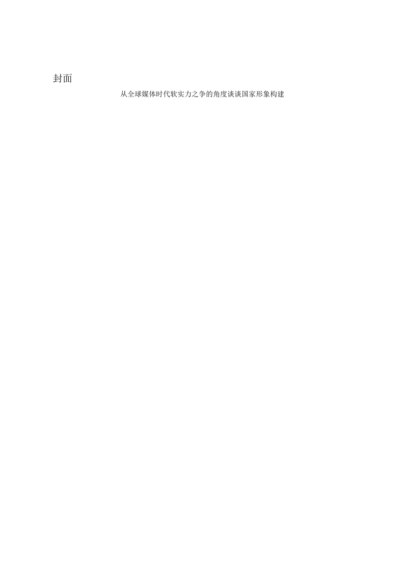 封面从全球媒体时代软实力之争的角度谈谈国家形象构建目录Abstract.…一、软实力竞争的方式…2(一)文化价值观特性的宣传(二)社会制度与模式的推销二、我国特色的软实力…(一)独立自主的和平外交…3(二)中国传统文化精髓…4三、国家形象塑造的措施(一)利用外交削减国外媒体及民众的误解.…4(二)改进对外传播体制4(三)有效运用新闻传播技巧结语…致谢…注释参考文献.6摘要随着各国之间经济、文化、政治的频繁交流,全球化成了各方面的发展趋势。然而我国文化融入世界确始于上世纪七十年代的改革开放后,时间较短,故而在软实力方面,我国与发达国家尚有一定的差距。在科技日益发展的现在,计算机逐渐普及,媒体对他国了解另一国的影响不断加深,如何在软实力之争中占据有利地位,成为每一个国民需要考虑的问题。本文从软实力竞争的方式出发,在介绍了具有我国特色的软实力之后,指出了国家形象塑造的三大措施,希望可以为我国国家形象塑造提供一定的借鉴。关键词:媒体:软实力:国家形象AbstractWith the frequent economic,cultural and political exchanges between countries,globalization has become a development trend in all aspects.However,China's culturalintegration into the world began in the 1970s after the reform and opening up,a shortertime,so in terms of soft power,China and the developed countries there is still a gap.Nowadays,the increasing popularity of science and technology,the computer graduallypopularization,the media to other countries to understand the impact of another countrycontinues to deepen,how to dominate the soft power struggle to become a national need toconsider the issue.Based on the soft power competition,this paper points out the threemeasures of shaping the image of the country after introducing the soft power with thecharacteristics of our country,hoping to provide some reference for the image of ourcountry.Key words:media;Soft power;National Image