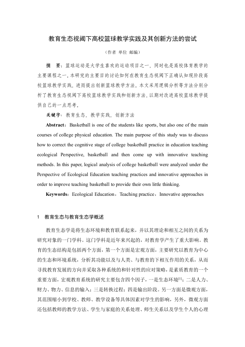 教育生态视阈下高校篮球教学实践及其创新方法的尝试(作者单位邮编)摘要:篮球运动是大学生喜欢的运动项目之一,同时也是高校体育教学的主要课程之一。本研究的主要目的讨论如何在教育生态视阚下正确认知现阶段高校篮球教学实践,进而提出创新篮球教学方法。本文采用逻辑分析等方法分别分析了教育生态视阈下高校篮球教学实践和创新方法,以期对改进高校篮球教学提供自己的一点思考。关健字:教育生态,教学实践,创新方法Abstract:Basketball is one of the students like sports,but also one of the maincourses of college physical education.The main purpose of this study was to discusshow to correct the cognitive stage of college basketball practice in education teachingecological Perspective,basketball and then come up with innovative teachingmethods.In this paper,logical analysis of college basketball were analyzed under thePerspective of Ecological Education teaching practices and innovative approaches inorder to improve teaching basketball to provide their own little thinking.Keywords:Ecological Education,Teaching practice,Innovative approaches1教育生态与教育生态学概述教育生态学是将生态环境和教育联系起来,并以其理论和相互之间的关系为研究对象的一门学科。这门学科是近年来兴起的,对教育学产生了重大影响。教育的生态结构是包括两个方面,第一个方面是宏观方面,主要研究以教育为中心的生态和环境系统,分析其功能以及与人类、与教育的下相互作用的关系,从而寻找教育发展的方向并采取各种系统的和针对性的应对策略,是素质教育的一个重要方面,宏观教育系统的研究主要包含四个因子,一是生态环境:二是人力、财力、物力、信息的输入:三是转换过程;四是输出阶段。另一方面是微观方面,其范围缩小到学校、教师、教学设备等具体因素对学生的影响,另外,微观方面还包括教师的教学方法、学生与家庭的关系处理、师生关系以及学生个人的心理状态。2教育生态视阈下的高校篮球教学实践2.1高校篮球教学的现状高校篮球教学的现状不容乐观,现阶段还存在一些较为严重的问题。首先,场地和器材的缺乏,目前很多高校的篮球场地只能供学生集体练习,分组练习或者教师单独辅导时场地问题就凸显出来,另外,学校的器材只供学生上课时使用,由于未建立一套有效的管理制度,学生不能在课余时间巩固相关知识和技能,这就制约了学校篮球教育的发展。其次,师资力量严重缺乏,当前高校专职篮球教师匮乏,由其它专项教师兼任篮球教学的现象比较突出,这就存在教师对于篮球的技能和知识的了解存在差距的问题,非专项教师一般在篮球的教学手法和教学手段上有所欠缺,严重影响了篮球的教学水平,特别是教育生态视阈下的篮球教学预期目的难以实现。第三,篮球教学的内容较为单调,篮球教学课程成了松散的篮球运动竞技项目,学生在未掌握基础的篮球知识和技能的情况下,依靠自身对篮球的直观印象进行练习,一旦受挫也难以找到原因,不知从何种角度进行训练提高,这也不利于激发学生对篮球的兴趣,给搞笑篮球教育的发展带来了困难。2.2教育生态视阈下的高校篮球教学实践首先,篮球教学目标方面,高校的篮球教学目标决定了教学的方向和方法,对篮球教学的整个过程都有很大的指导作用,根据国家的相关规定,高校的篮球教学要达到运动参与目标、身体健康目标、心理健康目标,但是现阶段高校篮球教学主要是以增强学生体质为目标,无论是高校教师还是学生自己,都是在这个目的引导下进行篮球训练,对篮球的文化价值和心理价值的认识十分欠缺,这对培养学生养成持久篮球锻炼习惯是非常不利的,高校篮球教学目标要充分体现篮球深刻的文化心理内涵,推动篮球教学目标全面实现)。其次,篮球教学内容方面,当前学者把篮球教学的内容主要分成两大快,即理论教学和实践教学的结合。在理论方面,教学内容不仅要体现思想性和系统性,还应该体现时效性和时代特点,近年来国家对于体育教学的改进幅度较大,但目前体育教学仍不能取得预期的目标,高校的体育教学还需要进一步改革,在今后的教学内容改革过程中,应重点突出学生的个体差异性,选用篮球教学所必须具备的最核心的内容予以教学,进而突出教材的针对性和实用性,实现教学内容的合理安排。在实践方面,现阶段各高校的篮球教学安排大多都是随机的,一些篮球教学的实践多数内容呈现浅显、流于形式的特征。另外,高校的篮球教学内容既要注重浅层的健身价值,更要注重篮球的认为精神,培养学生终生参加体育锻炼的意识。第三,篮球教学组织形式方面。教学的组织形式主要是指师生相互作用的结构形式,合理的教学组织结构形式,有利于提高学生的学习效果,进而实现教学的差别化和个别化。目前高校的教学实践主要是班级为基本的组织,该组织形式上便于安排上课,便于利用班级现有的管理结构和维持篮球锻炼的秩序,但由于每个学生的接受能力不一样,这种教学方式很难满足不同层次学生的学习习惯和需求,影响到学生学习篮球的兴趣性和积极性,难以取得良好的教学效果。另外,这种组织形式也不利于教师安排教学内容,教师只能取学生平均水平的内容进行教学设计。第四,篮球教学方法方面。现阶段高校的教学方法还是集中在传统的教师讲解阶段,情境法、发现法、游戏法等现代教学方式使用频率较低