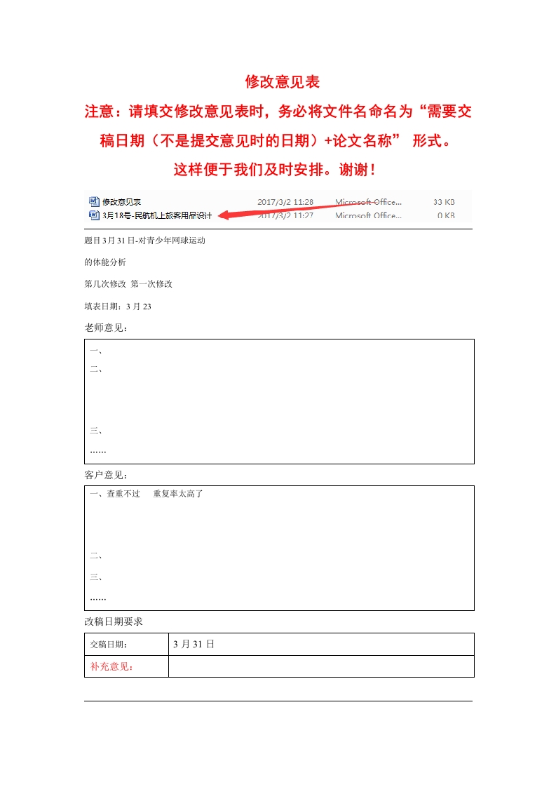 修改意见表注意:请填交修改意见表时,务必将文件名命名为“需要交稿日期(不是提交意见时的日期)+论文名称”形式。这样便于我们及时安排。谢谢!2017/3/211:28Microseft-Office...33 KB则3月18号-民航机上旅存用品设汁趣目3月31日-对青少年网球运动的体能分析第几次修改第一次修改填表日期:3月23老师意见:二、三、客户意见:一、查重不过重复率太高了三、改稿日期要求交稿日期:3月31日补充意见:修改须知:1.因修改需要根据意见查阅相关资料,修改论文内容一般三天左右,格式小问题可以加快,硕士博士毕业论文内容五天到一周左右,如需要加急修改,请和客服详谈。2笼统的意见,恕不修改。您要说出详细修改的意见哦,否则我们也不清楚您的想法。2.请不要将意见一点一点的提出来,请全部整理好以后,一次性发给我们,单独的意见不予受理。3.在与初衷无明显出入、不改变题目、文章整体思路和大框架的前提下,免费修改。换题目、大修改视为重写,不予免费。4.凡在成文后换题、追加、细化写作要求,属买家本身的责任,恕不免费修改,敬请谅解。