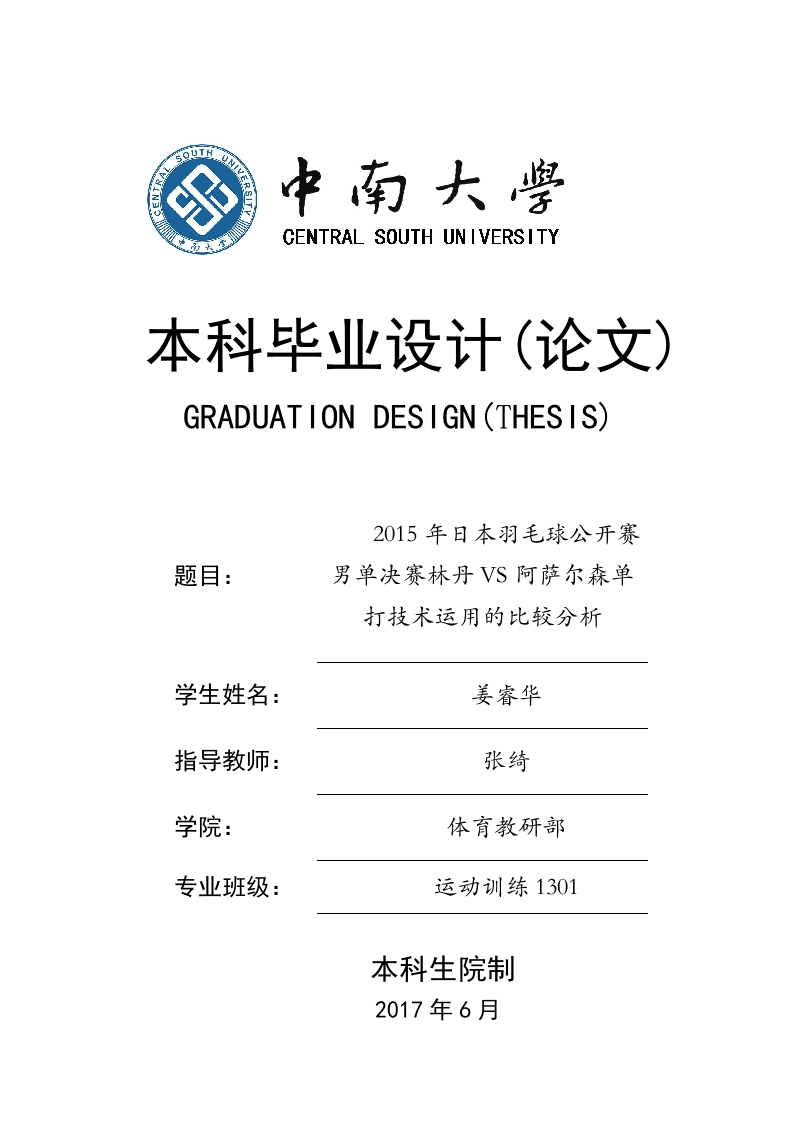 CENTRAL SOUTH UN IVERSITY本科毕业设计(论文)GRADUAT ION DES I GN (THES IS)2015年日本羽毛球公开赛题目:男单决赛林丹VS阿萨尔森单打技术运用的比较分析学生姓名:姜睿华指导教师:张绮学院:体育教研部专业班级:运动训练1301本科生院制2017年6月2015年日本羽毛球公开赛男单决赛林丹VS阿萨尔森单打技术运用的比较分析摘要在现在社会,特别是亚洲国家中,羽毛球已经成为最流行的运动之一。专业羽毛球比赛也极具观赏性,而其中男子单打鉴于其速度快,变化多、结果难预料等特点,也无可厚非的成为了最受人们关注的项目。本文运用了文献资料法、数据统计分析法以及录像观察统计法对2015日本羽毛球公开赛男单决赛林丹对阿萨尔森进行了技术分析,其中包括:发接发技术对比分析:高球、吊球技术对比分析:杀球、放网技术对比分析:挑球技术对比分析:以及平抽挡技术对比分析。结果显示林丹在面对小将阿萨尔森时主要以防守突击为主要得分手段,虽然阿萨尔森在身高,体能以及力量方面均占上风,但是却时刻被林丹控制在自己的节奏中。最终由于阿萨尔森体能下降而导致失误增多,进而引起情绪不稳等心理问题后败下阵来。关键词:日本公开赛林丹阿萨尔森羽毛球mmw2015年日本羽毛球公开赛男单决赛林丹VS阿萨尔森单打技术运用的比较分析ABSTRACTIn the last two decades,badminton has become one of the most popular sports aroundthe world,especially Asia.It is also known as one of the most enjoyable sports to watch inAsia.As a matter of fact,men's singles,due to their high speed,variability,andunpredictability,have attracted the most audience than any other events do.This essayimplements material reading method,statistics method,and game recording analysis methodto analyse men's single final in 2015 Japanese open,which was Lin Dan versus Axelsen.Itincludes services and service returns analysis,overhead and drop shots comparison,smashingand net shots analysis,lifting comparison,and both forehand and backhand driving shotscomparison.The result shows that Lin Dan was mainly defending and waiting foropportunities to gain winners.Although Axelsen takes advantages of his height,physicalability,and hitting strength,he was fully controlled by Lin Dan throughout the whole game.Consequently,as he got tired and started making unforced errors,he lost his psychologicalcontrol,furthermore,lost the game.Key word:2015 Japanese Badminton Open Lin Dan Victor AxelsenBadminton