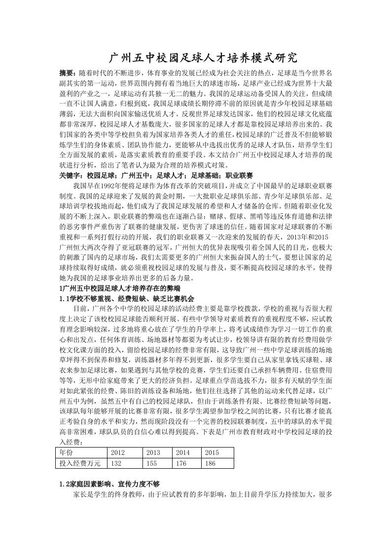 广州五中校园足球人才培养模式研究摘要:随着时代的不断进步,体育事业的发展已经成为社会关注的热点,足球是当今世界名副其实的第一运动,世界范围内拥有着当地巨大的球迷市场,足球产业己经成为世界十大最盈利的产业之一,足球运动有其独一无二的魅力。我国的足球运动备受国人的关注,但成绩一直不让国人满意,归根到底,我国足球成绩长期停滞不前的原因就是青少年校园足球基础薄弱,无法大面积向国家输送优质人才。反观世界足球发达国家,他们的校园足球文化底蕴都非常深厚,校园足球人才基数庞大,很多国家的足球人才都是靠校园足球培养出来的。我们国家的各类中等学校担负着为国家培养各类人才的重任,校园足球的广泛普及不但能够锻炼学生们的身体素质、团队协作能力,更能够从中选拔出优秀的足球人才队伍,培养学生们全方面发展的素质,是落实素质教育的重要手段。本文结合广州五中校园足球人才培养的现状进行分析,给出了笔者认为最为合理的培养模式对策。关键字:校园足球;广州五中:足球人才:足球基础:职业联赛我国早在1992年便将足球作为体育改革的突破项目,并成立了中国最早的足球职业联赛制度。我国的足球迎来了发展的黄金时期,一大批职业足球俱乐部、青少年足球俱乐部、足球培训学校拔地而起,他们成为了我国足球发展的希望和人才储备的仓库。但随着职业化发展的不断上深入,职业联赛的弊端也在逐渐凸显:赌球、假球、黑哨等违反体育道德和法律的恶劣事件严重伤害了联赛的健康发展,更伤害了球迷的信任。随着国家对足球联赛的不断重视和一系列打假行动的开展,我们的职业联赛又一次迎来的发展的春天,2013年和2015广州恒大两次夺得了亚冠联赛的冠军,广州恒大的优异表现吸引着全国人民的目光,也极大的刺激了国内的足球市场,我们太需要更多的广州恒大来振奋国人的士气,要想让国家的足球持续取得好成绩,就必须重视校园足球的发展与普及,要不断提高校园足球的水平,使得她为我国的足球事业培养出更多的后备力量。1广州五中校园足球人才培养存在的弊端1.1学校不够重视、经费短缺、缺乏比赛机会目前,广州各个中学的校园足球的活动经费主要是靠学校拨款,学校的重视与否很大程度上决定了该校校园足球能否顺利开展。有些中学领导对素质教育的重视程度不够,应试教育理念影响较深,过多地将重心放在了学生的升学率上,将考试成绩作为学习一切工作的重心和出发点,任何体育训练、场地器材等都要为考试让步,校领导讲有限的教育经费用做学校文化课方面的投入,留给校园足球的经费非常有限,这导致广州一些中学足球训练的场地草坪得不到保养和修复,训练器材多年得不到更新,很多学生要自己从家里拿钱买球鞋、球衣来参加足球比赛,如果遇到与其他学校的竞赛,学生们还要自己承担车辆费用、住宿费用等等,无形中给家庭带来了更大的经济负担。足球重点学苗选拔不力,很多有天赋的学生面对如此紧张的经费、陈旧的训练设备和场地,他们往往选择了其他的运动来代替足球,以广州五中为例,虽然五中有自己的校园足球队,但由于训练条件有限、比赛经费短缺等问题,该球队每年能够开展的比赛非常有限,很多学生渴望参加学校之间的比赛,只有比赛才能真正考验自身的水平和实力,然而现阶段没有一个完善的校园联赛制度,五中的球队的水平提高非常困难,球队队员的自信心难以得到提高。下表是广州市教育财政对中学校园足球的投入经费:年份2012201320142015投入经费万元1321551761861.2家庭因素影响、宜传力度不够家长是学生的终身教师,由于应试教育的多年影响,加上目前升学压力持续加大,很多家长认为学习在学校最重要的任务是把文化内容掌握好,踢足球不过是课余休息的一项运动,由于足球等体育竞技,时间成本较高,成材率较低,一旦没能走上足球职业化道路,孩子的学业也会被耽误,又由于国内足球负面消息一直较多,家长们担心学生会染上坏毛病,因此很少有家长能够支持孩子将足球当做今后发展的终身事业去做:调查中发现,大多数学生家长对“全国校园足球联赛”知之甚少,不清楚我国的校园足球发展现状,媒体和社会的宣传力度不够,很少有赞助商愿意冠名投入资金对校园足球进行投资,这使得校园足球很难吸收社会资本来发展壮大,没有社会知名度,学生和家长近期内看不到学生足球方面发展的前景,而这段时间往往是学生们血液最关键的时刻,导致一些学生在课后辅导班和足球之间难以选择,家长们则更倾向于让孩子们将课外时间用在课后辅导上,为今后的升学考试打下基础。1.3足球老师和教练员素质不高,数量不足当前广州中学的体育教师队伍数量还非常有限,很多体育教师课程压力较大,尤其缺乏专业的足球教练,很多学校的校园足球队的教练是由其他专业的体育教师担任,这对学生们足球基本功的锻炼和足球团队意识到养成都非常不利,而这种情况至今没有得到好转的趋势。广州市暂时只有个别中学做到了聘请专职足球教练的程度,大多数学校是由体育教师轮流兼任,因为学生在中学阶段正式足球基础养成的最佳时期,学生们技战术意识也是在这个时期逐渐培养出来的,校园足球队过于频繁的更换教练,必然会导致学生们基本功掌握不扎实、技战术思想混乱的现象,对学生们的