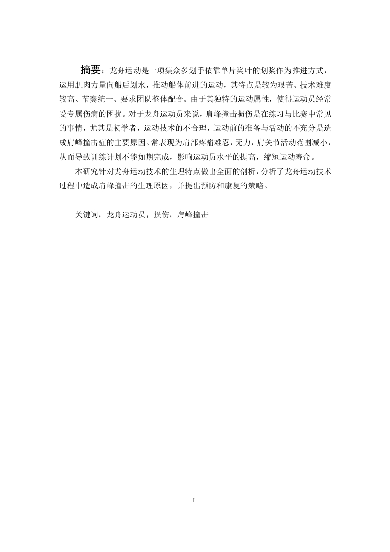 摘要:龙舟运动是一项集众多划手依靠单片桨叶的划桨作为推进方式,运用肌肉力量向船后划水,推动船体前进的运动,其特点是较为艰苦、技术难度较高、节奏统一、要求团队整体配合。由于其独特的运动属性,使得运动员经常受专属伤病的困扰。对于龙舟运动员来说,肩峰撞击损伤是在练习与比赛中常见的事情,尤其是初学者,运动技术的不合理,运动前的准备与活动的不充分是造成肩峰撞击症的主要原因。常表现为肩部疼痛难忍,无力,肩关节活动范围减小,从而导致训练计划不能如期完成,影响运动员水平的提高,缩短运动寿命。本研究针对龙舟运动技术的生理特点做出全面的剖析,分析了龙舟运动技术过程中造成肩峰撞击的生理原因,并提出预防和康复的策略。关键词:龙舟运动员;损伤:肩峰撞击IAbsrtact:Dragon boat sport is a kind of sport that many rowers rely on asingle paddle as a propulsion mode,use muscle power to row to the back of the boatand push the boat forward.It is characterized by relatively hard,high technicaldifficulty,uniform rhythm,and requires the overall cooperation of the team.Becauseof its unique sports attributes,athletes are often plagued by exclusive injuries.For theDragon Boat athletes,the acromion impact injury is a common thing in practice andcompetition,especially for the beginners,the unreasonable sports technology,theinadequate preparation and activities before sports are the main causes of acromionimpact.It is often manifested as shoulder pain,weakness,reduced range of motion ofshoulder joint,which leads to the failure of training plan,affects the improvement ofathletes'level,and shortens sports life.This study makes a comprehensive analysis of the physiological characteristicsof Dragon Boat Sports Technology,analyzes the physiological causes of the shoulderpeak impact in the process of Dragon Boat Sports Technology,and puts forward theprevention and rehabilitation strategies.Key Words:Dragon boat athlete;injury;acromion impact目录1(一)研究背景及意义1(二)研究对象22331.肩峰撞击症的受伤机制与症状32.龙舟运动员运动损伤因素及影响.EEEEEEEEEEEEEE S EEEEEEEE454.龙舟运动员肩峰撞击症的预防55.龙舟运动员肩峰撞击症的治疗678(一)研究对象101.文献资料法102.实地调查法101065.数理统计法1717171.干预前后两组运动员疼痛诱发试验结果172.干预前后两组运动员肩关节灵活度的对比.·1820201