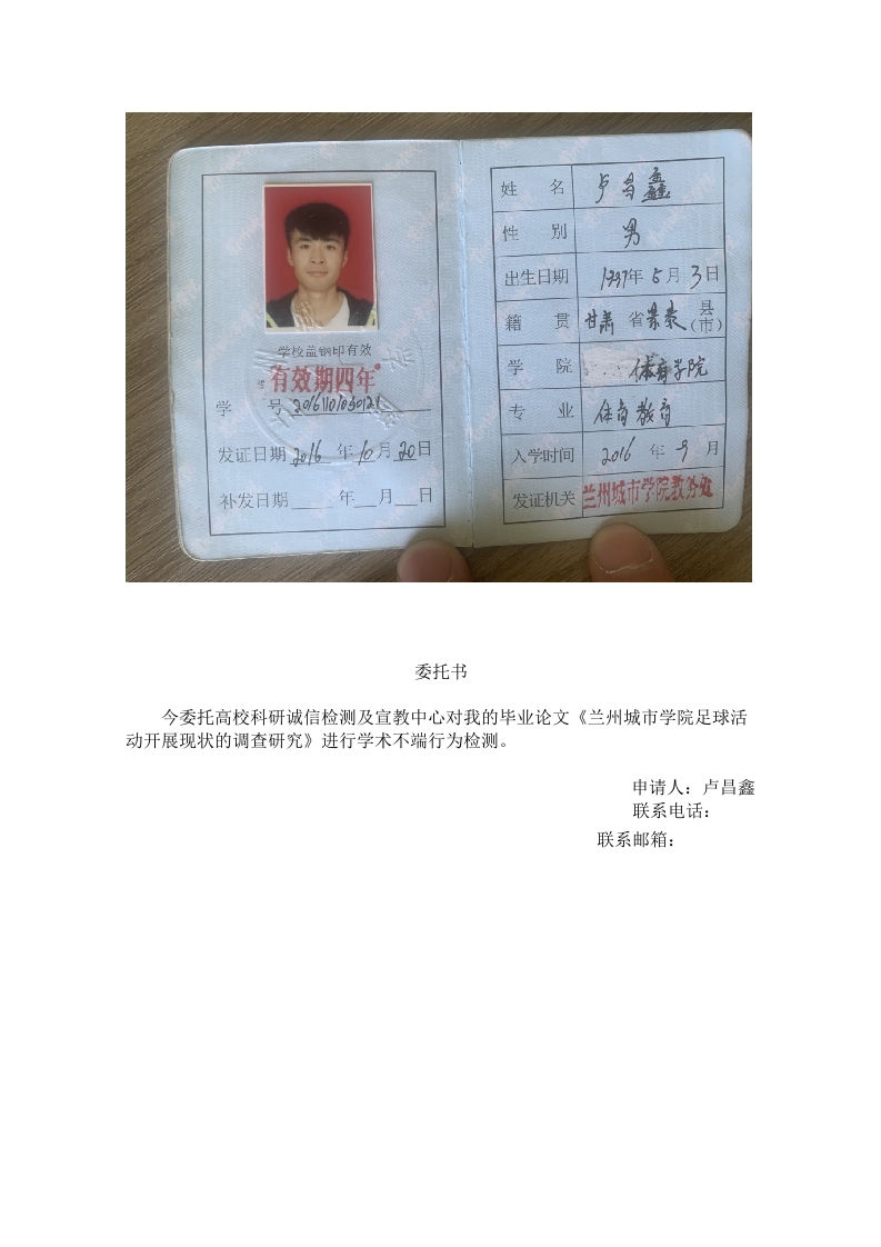 名性别出生日期籍贯学院学业发证日期年b月0日入学时间补发日期年月日发证机关委托书今委托高校科研诚信检测及宣教中心对我的毕业论文《兰州城市学院足球活动开展现状的调查研究》进行学术不端行为检测。申请人:卢昌鑫联系电话:联系邮箱:学号20161101050121密级兰州城市学院本科毕业论文兰州城市学院足球活动开展现状的调查研究学院名称:体育学院专业名称:体育教育学生姓名:卢昌鑫指导教师:王晋明BACHELOR'S DEGREE THESISOF LANZHOU CITY UNIVERSITYInvestigation and Research on the current situation of the development of campus football in Lanzhou City CollegeCollege Physical Culture InstituteSubject Physical EducationNameLu Chang XinDirected by Wang Jin MingMay 2020