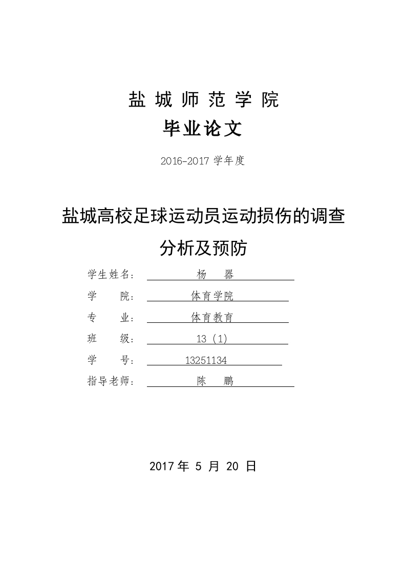 盐城师范学院毕业论文2016-2017学年度盐城高校足球运动员运动损伤的调查分析及预防学生姓名:杨器学体育学院专业:体育教育班级:13(1)学13251134指导老师:陈鹏2017年5月20日盐城师范学院毕业论文盐城高校足球运动员运动损伤的调查分析及预防摘要足球比赛身体对抗激烈,有的因为防守队员铲球动作不合理造成对方球员发生骨折等运动损伤,有的因为被防守队员冲撞后发生运动损伤,有的因为球员在快速奔跑过程中被绊倒、拉倒、铲倒等发生扭伤、拉伤等运动损伤,足球比赛中运动损伤的发生概率高,运动损伤的发生对于大学生参加足球训练、比赛带来较大影响,给大学生的心理带来较大的负担,也影响到高校足球比赛健康、和谐的发展,本文对盐城市部分高校足球运动员在大学期间足球损伤情况的调查分析,研究大学生在足球比赛、训练中发生运动损伤的特点和规律,探讨运动损伤发生的原因,为青大学生足球运动员在训练时候提出相关注意事项,降低运动损伤发生的机率,为足球运动损伤预防提供理论参考。【关键词】盐城高校:足球运动员:运动损伤:调查:预防盐城师范学院毕业论文Investigation and Prevention of Sports Injury ofFootball Players in Yancheng UniversityAbstractSoccer game body against the fierce,and some because the defensive team tackle actionunreasonable cause the other players have fractures and other sports injuries,and somebecause of the defensive player after the collision occurred sports injuries,and some becausethe players in the fast running process was tripped,Such as sprain,strain injury and othersports injuries,the occurrence of high risk of sports injuries in soccer games,the occurrenceof sports injuries for college students to participate in football training,the game has a greaterimpact on the psychology of college students to bring a larger This paper analyzes thecharacteristics of soccer injury in some college football players in Yancheng during theuniversity,studies the characteristics and laws of sports injury in college football in soccercompetition and training,and explores the characteristics of the movement of soccer playersin college football.The causes of the injury,for the young college football players in thetraining time to pay attention to matters,reduce the chance of sports injuries,football injuryprevention to provide a theoretical reference.[Key words]Yancheng University;football player;sports injury;investigation;prevention