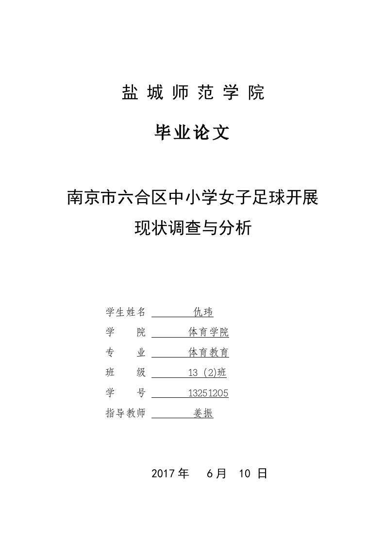 盐城师范学院毕业论文南京市六合区中小学女子足球开展现状调查与分析学生姓名仇玮学院体育学院专业体育教育班级学号13251205指导教师姜振2017年6月南京市六合区中小学女子业余足球训练南京市六合区中小学女子足球开展现状调查与分析摘要本文以南京市六合区中小学校为研究中心,运用文献资料、问卷调查、逻辑分析等方法,主要分析了这些学校女子足球开展的基本情况,从足球开展员、开展场地和器材、学生家长等多个因素进行了研究,发现南京市六合区中小学女子足球开展中存在如下问题:开展员综合素养不高,师资力量有待提高、场地器材难以满足开展要求、学生兴趣降低,缺乏对开展的正确认识以及家长的重视和支持程度不高。为了解决这些问题,本文提出如下建议:首先要建设专业的师资队伍,提高综合素养,其次教育部门要加大对场地器材的经费投入,使其满足开展要求,同时还要加强足球开展力度,培养学生的兴趣,最后要引起家长的关注和重视,改变传统的思想观念,这样才能更好地明确中小学女子足球的开展情况,促进足球运动的长期发展。【关键词】:中小学:女子足球:训练:教学南京市六合区中小学女子业余足球训练Investigation and analysis of women's footballin primary and middle schools in Sextiledistrict of Nanjing cityAbstractFootball as a sport is beneficial to physical and mental health of the students,by therecognition and love,but influenced by many subjective and objective factors,a lot ofwomen's football in primary and secondary schools to carry out the situation is notsatisfactory,and there are some problems.Therefore,primary and middle schools inLiuhe District of Nanjing city as the center of the study,use of literature,questionnaire,logical analysis and other methods,mainly analyzes the basic situationof the school women's football development,from soccer trainers,training venues andequipment,the parents of the students and other factors were studied and found thatthere are problems in women's football in Liuhe District of Nanjing city schools:trainers comprehensive literacy is not high,teachers need to be improved,it isdifficult to meet the requirements of training facilities,students interested in reducing,the lack of a correct understanding of amateur training and parents'attention andsupport degree is not high.In order to solve these problems,we propose the followingrecommendations:first,to build a professional team of teachers,improve thecomprehensive quality,the education departments should increase investment inequipment funding to meet the training requirements,but also to strengthen thefootball amateur training,cultivating students'interest,and finally to cause parentsconcern and attention,change the traditional ideas,so as to better define the women'sfootball in primary and secondary schools to carry out the situation,to promotelong-term development of football.[Key words I:Primary and secondary schools;woman's football;developmentsituation;status analysis2