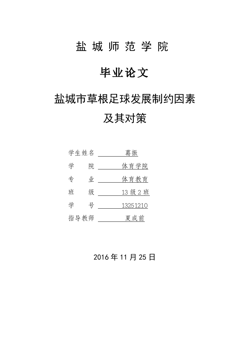盐城师范学院毕业论文盐城市草根足球发展制约因素及其对策学生姓名葛振学院体育学院专业体育教育班级13级2班学号13251210指导教师夏成前2016年11月25日盐城师范学院毕业论文摘要足球,现在风靡全世界。目前有200多个国家,十几亿人参与,现在已成为世界最大的体育运动。在全国全民健身活动的开展浪潮下,以及在中国国家队“屡战屡败,屡败屡战”的刺激下,足球运动在全国各地如火如茶的开展。盐城位于中国江苏省中部,地域广阔,人口众多。进几年来盐城市足球运动的发展有了长足的进步,有多家业余足球俱乐部相继成立,如奥强传媒子弹,师范明达等,这些俱乐部也会不定时进行联赛。本文以盐城市草根足球作为研究对象,分析其发展现状以及制约因素,并针对制约因素提出相应建议,为提高盐城市草根足球的水平,促进其良性的发展,减小与其他足球发展较好区域的差距。2盐城师范学院毕业论文AbstractFootball is now popular all over the world.With more than 200 countries andmore than a billion people participating,it has now become the world's largest sport.In the tide of national fitness activities,as well as in the Chinese national teamdefeated,keep on fighting under the stimulation of the development of football in thecountry like a raging fire.Yancheng is located in the central part of Jiangsu provincein China.It has a vast territory and a large population.In the past few years,thedevelopment of football in Yancheng City has made great progress.A number ofamateur football clubs have been established,such as Austria strong media bullets,normal teachers and so on,and these clubs will also perform league matchesirregularly.This paper takes Yancheng City grassroots football as the research object,analyzes its development status and restricting factors,and puts forward thecorresponding suggestions according to the constraints,in order to improve the levelof grassroots football in Yancheng City,to promote its healthy development,reducethe development gap with other regional good football[Key words]Yancheng City grassroots football,status,restriction factors,countermeasures3