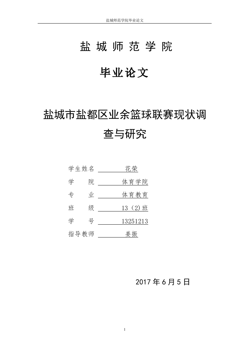 盐城师范学院毕业论文盐城师范学院毕业论文盐城市盐都区业余篮球联赛现状调查与研究学生姓名花荣学院体育学院专业体育教育班级13(2)班学号13251213指导教师姜振2017年6月5日1盐城师范学院毕业论文盐城市盐都区业余篮球联赛现状调查与研究摘要盐城市人民生活条件的提高,体育锻炼成为大众最喜爱的业余活动,而极易开展的篮球运动成为大众的最爱。业余篮球联赛也层出不穷。针对2016年夏在盐都区举行的业余篮球联赛在举办中所存在的问题,为进一步分析盐都区业余篮球联赛,了解业余篮球联赛组织中所存在的一系列问题,为组织者在以后举办联赛提供参考。笔者从2016年盐都区联赛出现问题的统计数据入手,采用文献资料法、逻辑分析法、调查问卷法、对参加盐都区业余篮球联赛运动员、教练员、裁判员进行基本情况的数据分析,了解盐都区业余篮球联赛在举办中所存在的一系列问题。为主办方在以后的比赛中中制定更科学的预案提供意见,有利于盐城地区篮球氛围提高,提高篮球运动的普及。【关键词】业余篮球联赛;现状:发展对策;运动员盐城师范学院毕业论文Investigation and Research on current situationof Amateur Basketball League in YanchengYandu DistrictAbstractWith the vigorous development of sports and people's demand for health,basketball game has been carried out among the masses and is loved by the masses ofChina.Targeting at the problem of the Amateur Basketball League held in Yandudistrict,summer of 2016,and for further analysis of Yandu district's AmateurBasketball League as well as a series of problems of Amateur Basketball Leagueorganization,to provide the reference for the following organizers.The author startswith the 2016 Yandu district League statistical data,with the method of literature,questionnaire,mathematical statistics and logical analysis,making a comparativeanalysis on 2016 Yancheng City District Amateur Basketball League to know theproblems about Yandu district's Amateur Basketball League.In order to improve thebasketball atmosphere in Yancheng and to improve the popularity of basketball,weshould formulate more scientific plans for future competitions.[Keywords I Amateur basketball league matches;Present situation;Developmentcountermeasure;Athletes;3