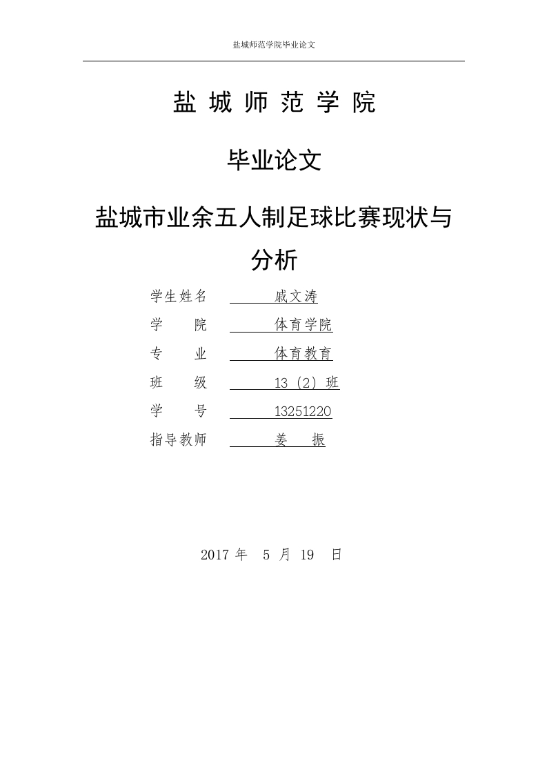 盐城师范学院毕业论文盐城师范学院毕业论文盐城市业余五人制足球比赛现状与分析学生姓名戚文涛学院体育学院专业体育教育班级学号13251220指导教师姜振2017年5月19日盐城师范学院毕业论文盐城市业余五人制足球比赛现状与分析摘要本文通过分析法、访谈法等研究方法,对盐城市五人制足球比赛开展现状进行分析,发现盐城市五人制足球比赛宣传力度不够,比赛经费、场地相对不足,缺乏高水平的裁判员和教练员等制约因素。根据其制约因素,提出了以下发展对策:加强五人制足球比赛的宣传:增加场地等硬件设施:多举办五人制足球比赛,加强教练员和裁判员的培训:提供相互交流与学习的机会。为盐城市五人制足球运动发展提供借鉴。【关键词】业余:五人制:足球比赛盐城师范学院毕业论文Present situation and analysis of amateurFutsal competition in Yancheng CityAbstractIn this paper,through the analysis,interviews and other research methods,toanalyze the situation of the Yancheng City Futsal competition,Yancheng City Futsalcompetition funds,lack of publicity,the relative lack of space,lack of referees andcoaches of high level restriction factors.According to the restricting factors,putforward the following countermeasures:strengthen the five football matchpropaganda;increase venues and other hardware facilities;to organise Futsalcompetitions,strengthen the training of coaches and referees;to provide mutualexchanges and learning opportunities.To provide reference for the development ofYancheng City Futsal.[keyword]Amateur;five man;a football match