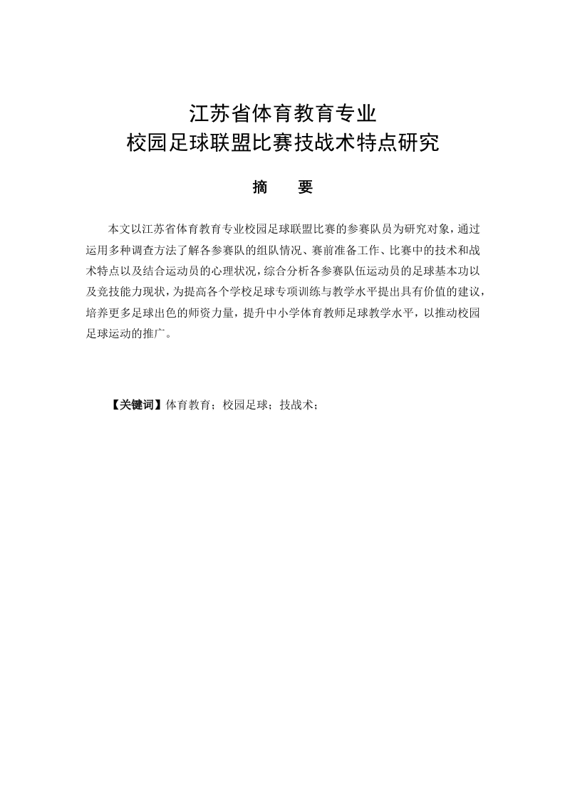 江苏省体育教育专业校园足球联盟比赛技战术特点研究摘要本文以江苏省体育教育专业校园足球联盟比赛的参赛队员为研究对象,通过运用多种调查方法了解各参赛队的组队情况、赛前准备工作、比赛中的技术和战术特点以及结合运动员的心理状况,综合分析各参赛队伍运动员的足球基本功以及竞技能力现状,为提高各个学校足球专项训练与教学水平提出具有价值的建议,培养更多足球出色的师资力量,提升中小学体育教师足球教学水平,以推动校园足球运动的推广。【关键词】体育教育:校园足球:技战术:Jiangsu Province physical education specialtyResearchontechnicalandtacticalcharacteristics of campus Football LeaguematchAbstractBased on the physical education specialty of Jiangsu Province Campus footballleague players as the research object,through the use of various survey methods tounderstand the team's team,preparation work,techniques and tactics in the game,combined with the psychological state of athletes,comprehensive analysis of the basicskills of football teams and athletes athletic ability status and valuable suggestions forimproving the school football special training and teaching level,cultivating moreexcellent football teachers,enhance the level of football teaching of PE teachers inprimary and secondary schools,to promote the promotion of campus football.[Key words]physical education;Campus football;Technique and tactics;目录2(二)本科组各支参赛队伍队员组队的情况.2三、本科组各参赛队伍专项技能测试情况分析..·3四、本科组各参赛队伍的竞技比赛中的技战术战术特点分析.·4(一)本科队伍竞技比赛中的进球数及进球方式分析.·4(二)本科队伍竞技比赛中的防守技战术分析..4五、小结…5六、参考文献…七、致谢