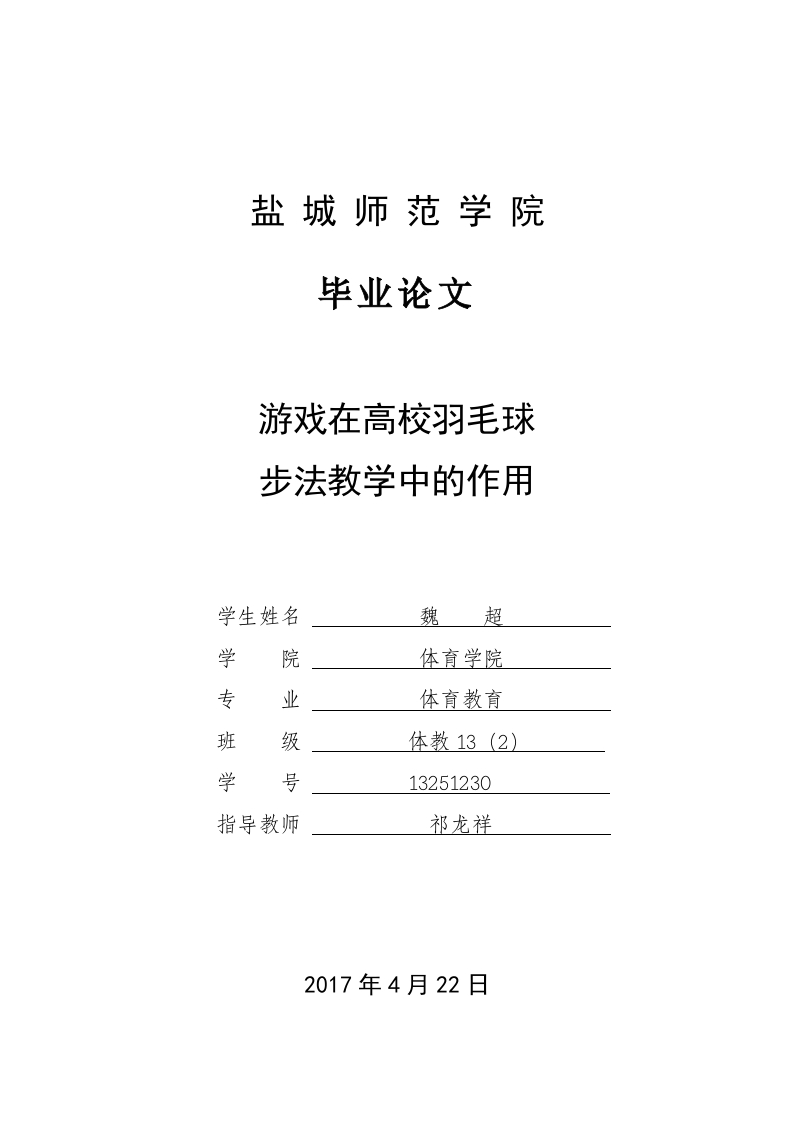 盐城师范学院毕业论文游戏在高校羽毛球步法教学中的作用学生姓名魏超学院体育学院专业体育教育班级体教13(2)学号13251230指导教师祁龙祥2017年4月22日盐城师范学院毕业论文游戏在高校羽毛球步法教学中的作用摘要游戏教学从上世纪八十年代诞生以来,受到不少国家的欢迎,并且广泛运用于多个领域。在教学中加入游戏,让学生在轻松自由的环境中中展示最真实的自我,能够破除目前的填鸭式的教育形式,师生在课堂交流中互相交流、互相理解、互相吸引、互相倾听。现在越来越多的学校将游戏教学法引入到氛围相对较枯燥的课堂中。羽毛球运动随便各大赛事的宣传,逐步渗入百姓家庭,深受体育爱好者的喜欢,在不少的高校中也推出羽毛球课程。在实际课程中,部分高校在羽毛球教学中特别注重对羽毛球手法的学习,从而忽视了羽毛球步法的学习,最大的原因归于羽毛球步法在学习过程中运动量大且枯燥乏味,学生不愿主动学习,对教师的教学进度的推进也有着一定影响。倘若利用游戏趣味性的这一特性,在高校课堂中加入游戏渗透,一定能培养起学生的学习兴趣,提高教学的质量,从而达到教学目的。本文以盐城师范学院公共体育羽毛球选修课的2016级大学生为研究对象,总计80人,采用文献资料法、数理统计法、逻辑分析法、实验法等方法,探究讨论游戏在高校羽毛球步法教学中的作用。【关键字】游戏:高校:羽毛球步法:实验盐城师范学院毕业论文The role of games in the teaching of Collegebadminton footworkAbstractSince the dawn of games from the 80's of last century,was welcomed by manycountries,and is widely used in many fields.Added to the game in teaching forstudents in an environment of freedom in the most authentic self,can break awayfrom the existing spoon-feeding education,teachers and students in classroomcommunication,Exchange,mutual understanding,mutual attraction,listen to eachother.Introduced the game to more and more schools are now in relatively dryatmosphere of the classroom.Publicity of any major tournament in badminton,gradually into the family,by sports fans enjoy,in many universities offeringbadminton course.In practical courses,in some universities in badminton teaching ofthe special focus on badminton skill learning,thereby ignoring the footwork forbadminton learning,biggest badminton footwork during the learning process due toheavy and boring,students from volunteering to learn,advance of teachers teachingprogress also has an impact.If using this character of gaming fun,added penetrationin the college classroom,must be able to cultivate students interest in learning,improving the quality of teaching,so as to achieve the goal.Article 2016 students ofYancheng teachers college public physical education badminton optional course forthe study,a total of 80 people,using literature,statistical method,the method oflogical analysis,experimentation,and research discuss the role of games in theteaching of College badminton footwork.[Key words]the game;Colleges and universities;Badminton gait;Theexperiment
