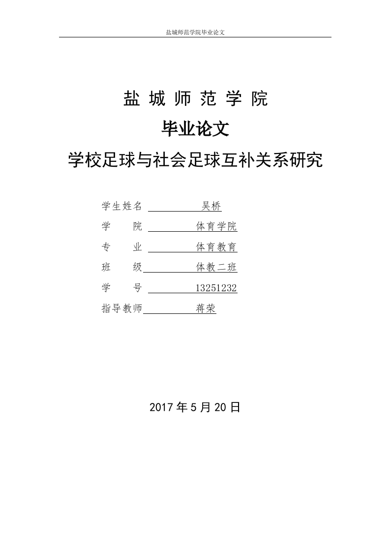 盐城师范学院毕业论文盐城师范学院毕业论文学校足球与社会足球互补关系研究学生姓名吴桥学院体育学院专业体育教育班级体教二班学号13251232指导教师蒋荣2017年5月20日盐城师范学院毕业论文学校足球与社会足球互补关系的研究摘要在调查了解学校足球与社会足球的管理体制、训练模式、场地器材设施及社会关注度等等现状的基础上,对学校足球与社会足球互补关系进行研究,并提出促进学校足球与社会足球共同发展的策略,提升中国足球的整体水平。【关键词】学校足球:社会足球:互补关系:共同发展盐城师范学院毕业论文Football school and football society researchof complementary relationshipAbstractIn investigating the management system of football school footballand society,the training mode,space equipment facilities and socialawareness,and so on factors,the status quo,on the basis of study offootball complementary relationship between society and school football,and promote common development strategy is put forward.