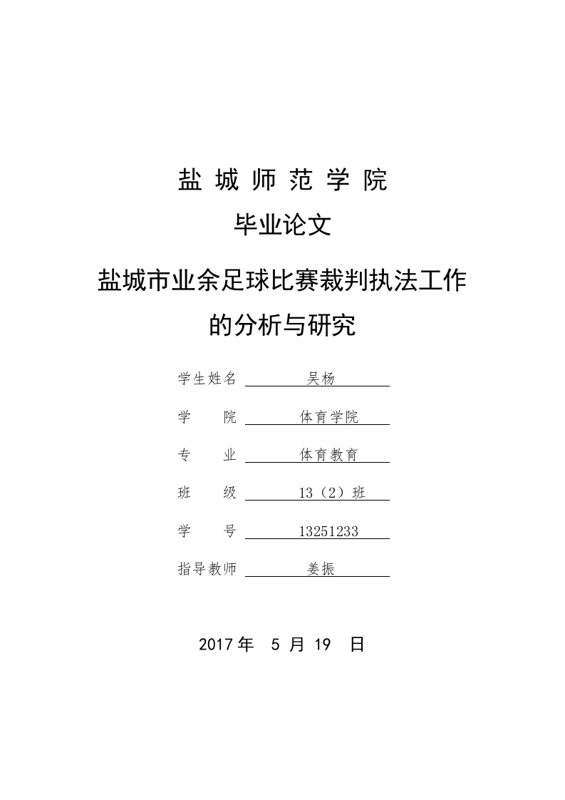 盐城师范学院毕业论文盐城市业余足球比赛裁判执法工作的分析与研究学生姓名吴杨学院体育学院专业体育教育班级13(2)班学号13251233指导教师姜振2017年5月19日盐城师范学院毕业论文盐城市业余足球比赛裁判执法工作的分析与研究摘要本文以盐城市业余足球比赛中各裁判执法情况为研究对象,通过文献分析法、经验总结法和观察法,分析盐城市各业余足球裁判的执法能力、心理状态、执法方式和培训学习情况,提出培养裁判技能、提高判罚准确性、加强裁判管理培训的建议,为业余比赛裁判执法工作提供参考,提高盐城市业余足球裁判的执法能力。【关键词】业余:足球比赛;裁判工作:执法1盐城师范学院毕业论文Analysis and Research on the Judge 's LawEnforcement in Yancheng Amateur FootballSummaryThis paper takes the Yancheng City amateur football match in the referee as a researchobject,through the investigation and interview,analysis of mental state of the YanchengCity amateur football referee,law enforcement and law enforcement capabilities,trainingand learning situation,put forward to cultivate the referee skills,improve the decisionaccuracy,strengthen the management and training of referees suggestions,provide areference for the amateur referee the work of law enforcement,improve law enforcementcapability of the Yancheng City amateur football referee.[KEYWORD]Amateur The football match The referee;Law enforcement2