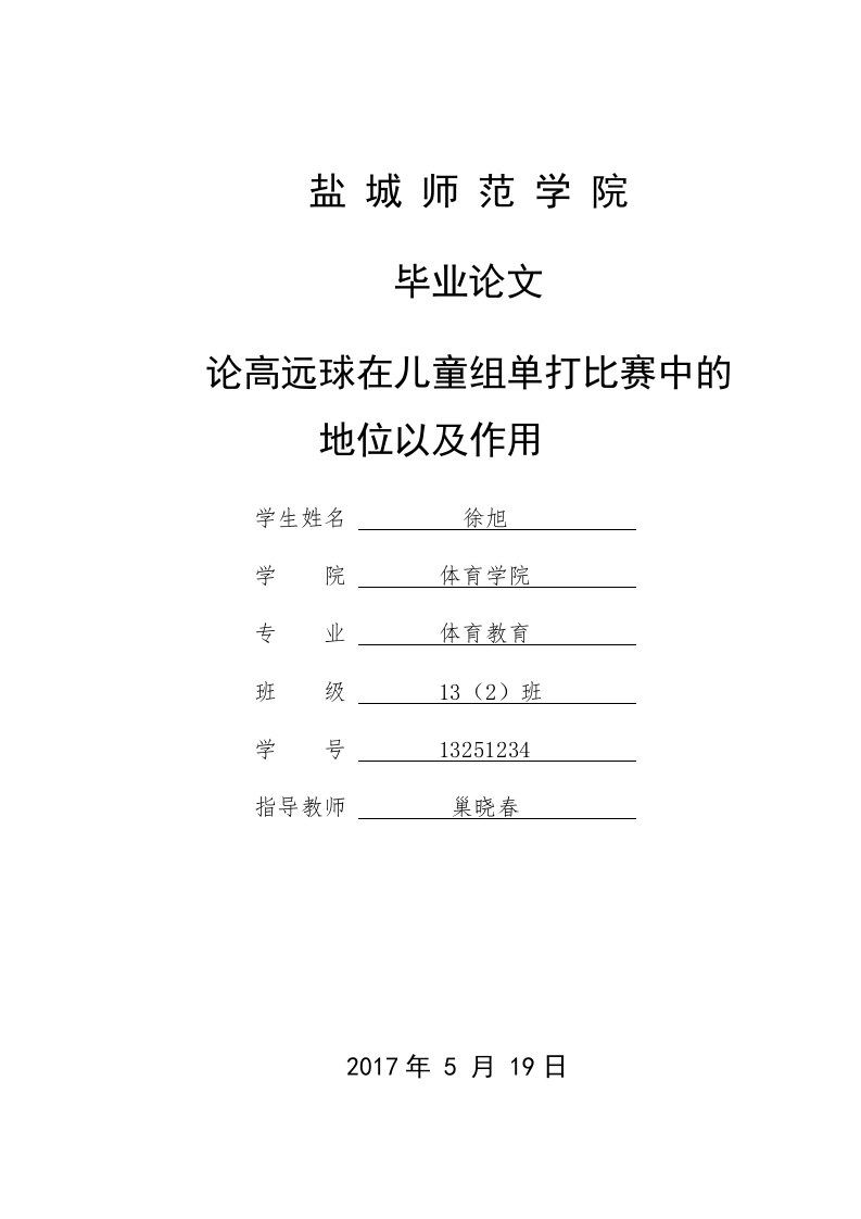 盐城师范学院毕业论文论高远球在儿童组单打比赛中的地位以及作用学生姓名徐旭学院体育学院专业体育教育班级13(2)班学号13251234指导教师巢晓春2017年5月19日盐城师范学院毕业论文论高远球在儿童组单打比赛中的地位以及作用摘要高远球是儿童组羽毛球运动员在训练中掌握的第一项基本击球技术。高远球这一基本技术,是儿童组单打比赛中运用的最多的基础击球技术。通过对高远球地位和作用的分析,得出高远球在儿童组单打比赛中的地位,和影响比赛结果的作用。突出在教学训练中应该抓好的重点。使儿童组运动员能够通过合理的利用高远球技术和战术,提高比赛成绩。【关键词】高远球:儿童组;地位:作用;注意点盐城师范学院毕业论文On the position and function of the loftyballin the youth groupAbstractThere is a direct relationship between the results of the badminton competition andthe physical quality of the athletes and the technical proficiency of the children.GaoYuanqiu is the first basic batting technique in the training of badminton players.GaoYuanqiu is one of the most basic techniques used in the group match,so the reasonableapplication of the technique of the badminton in the children's badminton team can havea direct impact on the result of the competition.Based on the analysis of the role andstatus of the high level ball,the paper points out the importance of the lofty ball in thechildren's group and the key points in the teaching and training.So that athletes canmake good use of the high technology,improve the performance of the game.[Key words]lofty ball,youth group,position,function,Attention in training