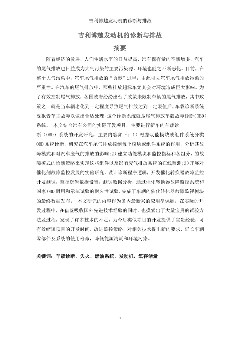 吉利博越发动机的诊断与排故吉利博越发动机的诊断与排故摘要随着经济的发展,人们生活水平的日益提高,汽车保有量的不断增多,汽车的尾气排放也日益成为大气污染的主要污染源,环境也随之不断恶化。目前,在整个大气污染中,汽车尾气排放的“贡献”过半,由此可见汽车尾气排放污染的严重性。在汽车的尾气排放中,那些排放超标车尤其会对环境造成巨大影响。为了有效控制尾气排放,各国政府纷纷出台了政策来限制车辆的尾气排放,其中政策之一就是当车辆老化到一定程度导致尾气排放达到一定限值后,车载诊断系统要报告车主故障以做出合适处理,这个诊断系统就是尾气排放车载故障诊断(OBD)系统。本文结合汽车公司的实际开发项目,主要进行新车的车载诊断(OBD)系统的开发研究,主要内容如下:1)根据功能模块或组件系统分类OBD系统诊断,研究在汽车尾气排放控制每个模块或组件系统的作用,分析其故障模式和对汽车废气的排放的影响:2)建立功能模块和监控指标和各组分,的故障模式的诊断策略来实现这些组件以及影响废气排放系统的在线监测:3)开展对催化剂故障监控发展的实验研究,设计诊断程序逻辑,开发催化转换器故障监控开发测试,监控逻辑数据设置,测试数据分析,通过催化转换器故障监控系统和国家OBD耐用和示范试验的耐久性试验,完成了车辆的催化转化器故障监视模块的最终数据发布。本文研究的内容作为国内最新兴的应用型课题,在实际的开发过程中,在借鉴吸收国外先进技术经验的同时,也摸索出了大量宝贵的试验方法及过程,发现了许多技术的不足,为今后类似项目的开发提供了宝贵经验,可有效缩短项目的开发时间,改进监控策略,对相关技术提出新的要求,延长车辆零部件及系统的使用寿命,降低能源消耗和环境污染。关键词:车载诊断,失火,燃油系统,发动机,氧存储量吉利博越发动机的诊断与排故AbstractWith the development of economy and the improvement of people's livingstandards,the number of cars in the country is increasing.With thecontinuous increase,the exhaust emission from automobiles hasincreasingly become the main source of air pollution.The environment isalso deteriorating.At present,in the whole air pollution,automobileexhaust emissionsThis shows the seriousness of automobile exhaustpollution.In the car Of the total emissions,those exceeding thestandard will have a great impact on the environment.ForIn order toeffectively control exhaust emissions,governments of various countrieshave issued policies to limit the tail of vehicles.Gas emission,one ofthe policies is to cause exhaust emission when vehicles age to a certainextent.After reaching a certain limit value,the on-board diagnosissystem shall report the vehicle owner's fault to make a suitable place.Li,this diagnostic system is the exhaust emission on-board faultdiagnosis (OBD)system.Based on the actual development project of theautomobile company,this paper mainly carries out on-board diagnosis ofnew cars.The main contents of the research and development of OBD systemare as follows:1)classify and study OBD system diagnosis according tofunctional modules or component systems The function of each module orcomponent system in vehicle exhaust emission control is analyzedEffectiveness model and its impact on vehicle exhaust emission;2)Establish monitoring indexes and diagnosis of failure modes of variousfunctional modules and componentsStrategy to achieve vehicle onlinemonitoring of these components and systems that affect exhaust emissions;3)Carry out experimental research on catalyst failure monitoring anddevelopment,design diagnostic programlogic,and carry out catalystfailure monitoring and development test,monitoring logic data settingand test According to the analysis of the test data,the durability testof the catalyst failure monitoring system and the state have been passed.The OBD durability and demonstration test completed the final monitoringmodule of vehicle catalyst failure.Data release.The research content ofthis paper,as the latest application-oriented topic in China,is actuallydevelopingIn the process of development,while learning from andabsorbing foreign advanced technology experience,we have also made greatachievements.Valuable test methods and processes have found manytechnical deficiencies for the future similarThe development of theproject provides valuable experience,which can effectively shorten thedevelopment time of the project and improve it.Monitoring strategy,putforward new requirements for related technologies,extend the vehicleparts and systems Service life,reduce energy consumption andenvironmental pollution.Key words:on-board diagnosis,fire,fuel system,start-upOxygen storagecapacity吉利博越发动机的诊断与排故目录41.1研究背景..41.2研究目的与意义6二发动机的诊断与排故...92.1故障诊断的一般原则9112.2.1诊断过程...112.2.2模糊诊断方法..122.2.3故障树诊断方法.122.2.4神经网络诊断方法..·132.2.5主元分析法诊断14161718