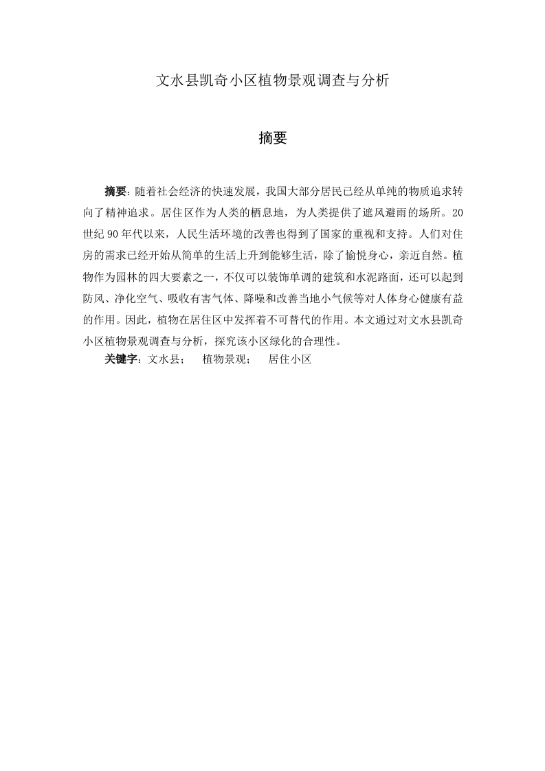 文水县凯奇小区植物景观调查与分析摘要摘要:随着社会经济的快速发展,我国大部分居民已经从单纯的物质追求转向了精神追求。居住区作为人类的栖息地,为人类提供了遮风避雨的场所。20世纪90年代以来,人民生活环境的改善也得到了国家的重视和支持。人们对住房的需求已经开始从简单的生活上升到能够生活,除了愉悦身心,亲近自然。植物作为园林的四大要素之一,不仅可以装饰单调的建筑和水泥路面,还可以起到防风、净化空气、吸收有害气体、降噪和改善当地小气候等对人体身心健康有益的作用。因此,植物在居住区中发挥着不可替代的作用。本文通过对文水县凯奇小区植物景观调查与分析,探究该小区绿化的合理性。关键字:文水县:植物景观:居住小区ABSTRACTABSTRACT:With the rapid development of social economy,most of theresidents in China have changed from simple material pursuit to spiritual pursuit.Asthe habitat of human beings,residential areas provide shelter from wind and rain forhuman beings.Since the 1990s,the improvement of people's living environment hasalso received the attention and support of the state.People's demand for housinghas begun to rise from simple life to being able to live,in addition to pleasing bodyand mind,close to nature.Plants,as one of the four major elements of gardens,cannot only decorate monotonous buildings and cement pavement,but also play abeneficial role in wind protection,air purification,absorption of harmful gases,noisereduction and improvement of local microclimate.Therefore,plants play anirreplaceable role in residential areas.Through the investigation and analysis of theplant landscape in Kaiqi District of Wenshui County,this paper explores therationality of greening in this district.KEYWORDS:Wenshui County;Plant Landscape;Residential District目录一、研究背景及意义.4二、调查地概况.6三、调查结果分析…四、各类绿地植物景观设计分析…74.1入口空间植物景观774.1.2建筑入口…84.2组团绿地植物景观84.3临水植物景观4.4宅旁绿地植物景观94.5活动空间植物景观4.5.1儿童活动场地4.5.2运动场地4.6道路绿化五、小区绿化设计…5.1树种选择…115.2植物配置.115.3注重植物群和色块的应用5.4主次分明,增加空间.125.5注重季节与色彩的搭配六、存在的一些优点以及缺点….136.1.1植物种类丰富,生长繁茂.136.1.2造景植物的选择较人性化.136.2缺点.136.2.1植物种类不够丰富…136.2.2植物景观文化内涵不丰富…6.2.3植物配置的四季景色变化欠缺…147.1注重植物的生态习性,在植物配置中挖掘乡土树种.147.2引入绿化树种和丰富植物多样性的选择主要为乡土树种。.157.3丰富植物层次结构,开发利用空间结构157.4坚持因地制宜,强调人性化设计.…157.5注重植物景观的文化内涵…7.6增加各种彩叶植物和观赏花卉的使用167.7加强植物景观文化内涵的展示.…
